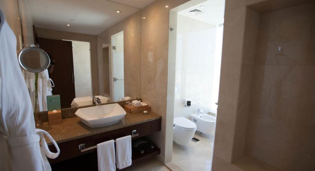 В ванной комнате: ванна, душевая кабина, отдельно туалет. Все аксессуары для душа меняли каждый день. Все чистое и рабочее. Автоматические ролеты, и в туалете, и в ванной - вид панорамный на Шейх Заед роад.