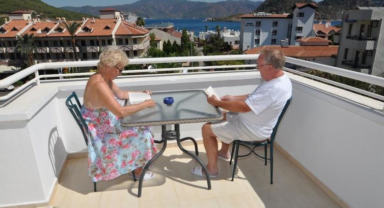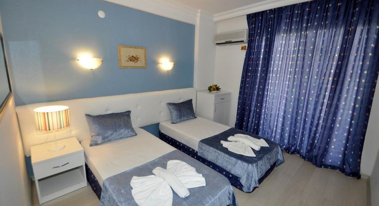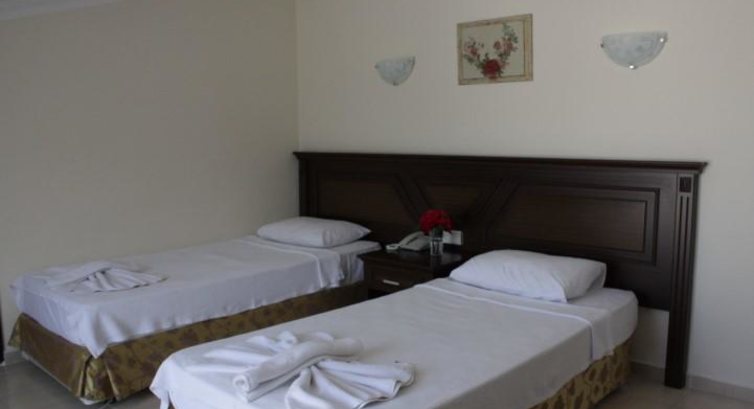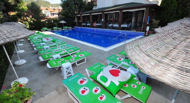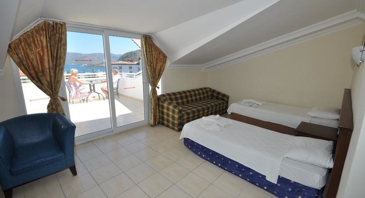 Если вас интересует качественный отдых, то вам сюда! У нас была проблема при заселении: нас заселили в номер для персонала ( потому что в нашем номере туристы остались еще на одну ночь). Это, конечно, для первого дня было шоком. Но мой молодой человек, с которым мы и отдыхали пообщался с хозяином, вызвал гида из Корал трэвел и все разрешилось: нам предложили переехать в другой отель на этот день или бесплатную экскурсию (прогулка на яхте). Мы выбрали прогулку на яхте и остались довольны. Затем нас пересилили в наш настоящий зобронированный номер: мебель новая, все уютно и чисто. Ежедневно проходит уборка (но минус нам не предоставляли мыло, так как увидели, что мы достали свое). ЕДА: так вкусно в отеле мы не питались никогда! Отдельное спасибо шеф повару. Были вкусные завтраки: огромный выбор хлопьев, молоко, йогурт, яишница, омлет, блинчики, фасоль в томатном соусе, обычные яйца, хлеб, булочки, сладостни, овощи, фрукты (арбуз, апельсины, дыни). И главное, что готовится многое на глазах. Ужины тоже были очень вкусные, разнообразные блюда, салаты, овощи, фрукты, на выбор гарниры, мясо, суп. И все уже не припомню! Вообщем за питание 5+. Местность чудесная вокруг, море чистое, горы - воздуууух. Советуем взять на прокат велосипеды или скутеры и прокатиться до Мармариса по береговой линии. (Торгуйтесь, они очень завышают цены). Удобно, что рядом есть супермаркеты. Мы часто покупали там свежий хлеб, колбаски, овощей и обедали на пляже. ВСЕХ ПУГАЮТ ГИДЫ В ТУРАГЕНСТВАХ БЕРИТЕ ТОЛЬКО ВСЕ ВКЛЮЧЕНО, КАК ТАК ВЫ БУДЕТЕ БЕЗ ВОДЫ, НАПИТКИ САМОЕ ДОРОГОЕ. НЕ ПРАВДА!!! Вода стоит копейки. Минеральная 0,25 лиры за 0.5 бутылочку, сладкие и алкогольные тоже в адекватной расценке. Отдельное спасибо Наташе и Саше, которые работают в отеле. Очень выручали, так как в Мармарисе пока что отдыхает не так много русских.