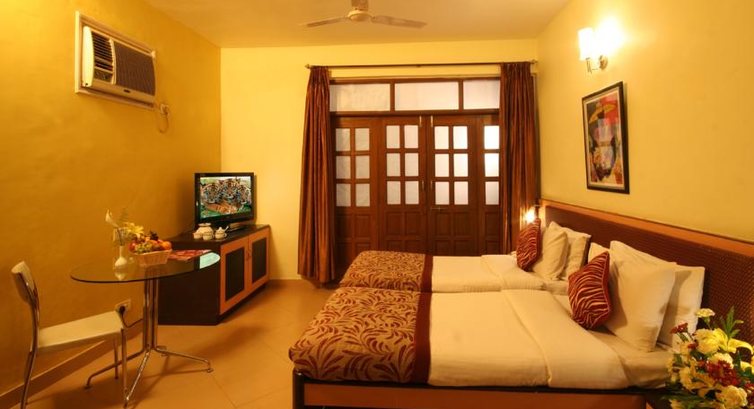 Хороший отель для Гоа, просторные номера, но немного потертая мебель, двуспальная кровать, 2 кресла с которых можно сделать кровать, телевизор, надор для приготовления чая и кофе, телефон.