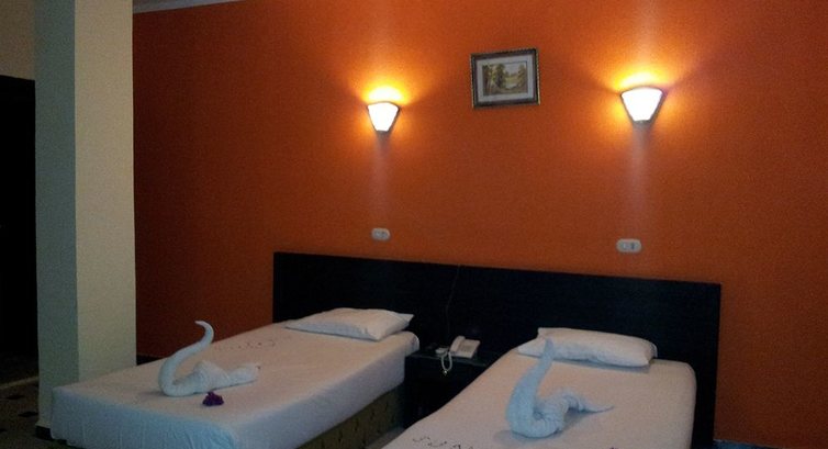 Номер. При размещении увидели рой мух, показали пальцем. Обслуга сообразила по-своему: принесли и рапылили дихлофос. На наши вопли через минуту принесли и распылили туалетный "фреш". На двоих в номере 1 стул+ столик, по размерам очень похожи на нашу мебель в детском саду. За чаевые принесли еще 1 стул. Номер больше похож на больничную палату советских времен. В углу во всю стену сырое пятно. Вообще впечатление, что отделочники первый раз в жизни делали ремонт. Краска на стенах свернулась, т.к. в спешке красили по-сырому. Ванная комната- отдельная песня. То что нет фена меня совсем не удивило. Ванная пластиковая, прогнутая, под весом тела ходила ходуном, из-под нее при включенном кране текла вода. Заметьте, шторки для ванной не было, мылись вприсядку. Зеркало было прикреплено снизу на гвозде, сверху прозрачным скотчем. Никаких полочек или крючков. Плитка уложена сикось накось. В номере все время пахло краской. Окно (советских времен) закрыли намертво только с помощью обслуги. Мух я убивала полотенцем (при 3-х метровых потолках это было сложно), но они снова залетали через щели в дверях и окнах. Кровати удобные, кондиционер работал хорошо. Сейфов нет, деньги все время прятали, т.к. туристы жаловались на воровство.