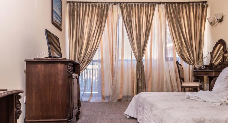 Если мне что-то и понравилось в Болгарии, то это Несебр и этот отель! Ощущения потрясающие, особенно рано утром, когда на улицах нет туристов. Плеск волн, крики чаек, местные жители, пьющие утренний кофе на крыльце своих домов, запах моря и свежей выпечки. Отель выглядит очень стильно, под стать старому Несебру. Живешь в средневековом городе, кругом дома из дерева и камня, булыжные мостовые. Внутри отель тоже стилизован под старину, очень уютно. У меня номер был мансардный без балкона, но т.к. я приехала только на три дня меня это не расстроило. Номер просторный с большой очень удобной кроватью, в шкафу были дополнительные подушки(новые) и плед, на полу пушистый БЕЛЫЙ ковролин, разуваться хотелось в коридоре. Мебель деревянная а-ля антиквариат. Телевизор, минибар, столик с креслами. В ванной комнате ванна с пластиковыми дверцами. Каждый день меняли полотенца, приносили гель, шампунь, мыло, ватные палочки. Убирали отлично.