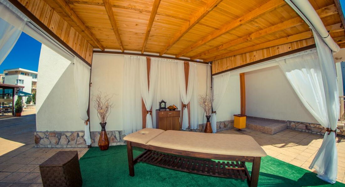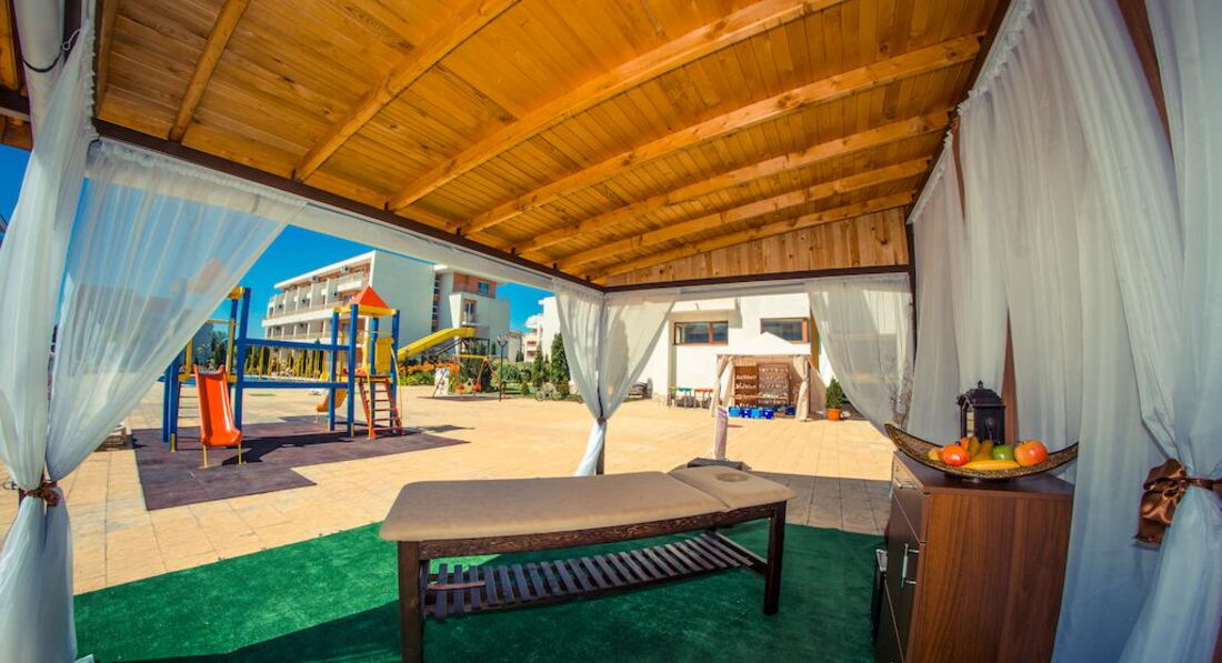 Напротив комплекса находится большой аквапарк! Через дорогу за соседним отелем большой супермаркет. Кто не захочет утруждать себя готовкой, всегда найдет, что купить там. Там есть кулинария,очень много полуфабрикатов, десертов. Рядом овощная база. От комплекса ходит экспресс до пляжа и Несебра ( мы предпочитали ходить пешком). Единственное неудобство-это то,что отель располагается за окружной трассой Солнечного берега и надо понимать какой там трафик в летний период! Поэтому перейти дорогу-это иногда очень проблематично. Есть надземный переход, но до него надо идти в противоположную сторону. Неудобно.