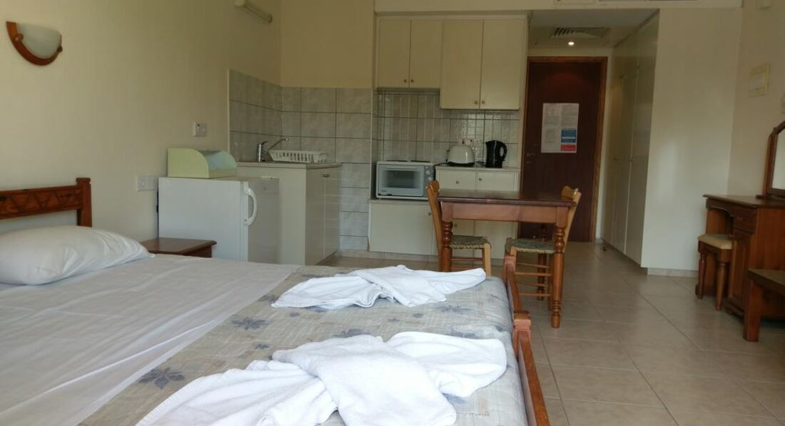 Готель зручно розташований у туристичній зоні Пафосу, в оточенні безлічі ресторанів, магазинів та барів, в пішій доступності від пляжу. Номери з повністю обладнаною кухнею. Рекомендуємо для бюджетного сімейного відпочинку.