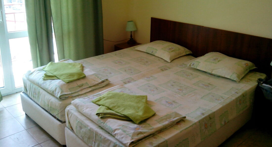 Приехали в 4 утра в отель, но заселение было только после 10-11, разрешили оставить вещи на ресепшене, ждали поселение на пляже. Мы просили, чтобы нас поселили в номер для двоих, но с одной двухспальной кроватью, нам пошли на встречу и поселили в трехместном номере (была свободная одна кровать), но с двухспальной кроватью. Жили в 7 номере, 2 корпус. Номер чистый, новая мебель, кондиционер, тв, холодильник работает исправно. Убирали номер, только если оставляешь ключ от номера на ресепшене (не сразу поняли это правило и первые три дня никто не убирал). В номере было 2 кровати, три стула, стол, шкаф, тумба, холодильник, кондиционер, зеркало; в ванной унитаз, умывальник и душ, но без стен и поддона, поэтому вода часто стояла в ванной, но после душа мы в основном уходили из номера и по возвращению уже был сухой пол. На балконе стол и три стула, пепельница. Вид из балкона на двор отеля и двор магазина, до 2 ночи слышно бар-караоке, но если закрыть балкон - не слышно. В номере нет чашек, чайника, так что нужно взять с собой для удобства. При отеле ресторан, цены демократичные, порции большие. Кранево - небольшая деревушка, отелей не очень много, частный сектор есть, экскурсии можно заказать только в одном месте, поэтому ездили сами в Балчик (но нужно учесть, что из Балчика автобус последний приходит в Албену уже после того, как последний автобус отправится до Кранева, так что нужно ездить утром иначе придется идти, как нам по пляжу с Албены в Кранево :). Также брали на прокат машину и ездили одним днем в Аладжа монастырь, Обзор, Варну, Несебр, Святой Влас. Дорога ровная, с указателями (брали машину без навигатора), вдоль моря, так что всегда могли свернуть и покупаться.