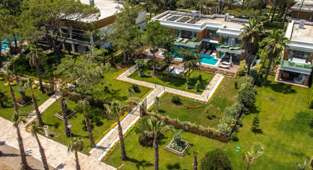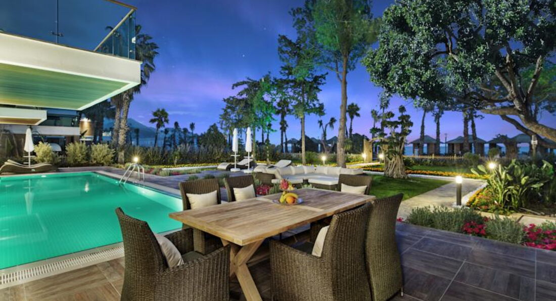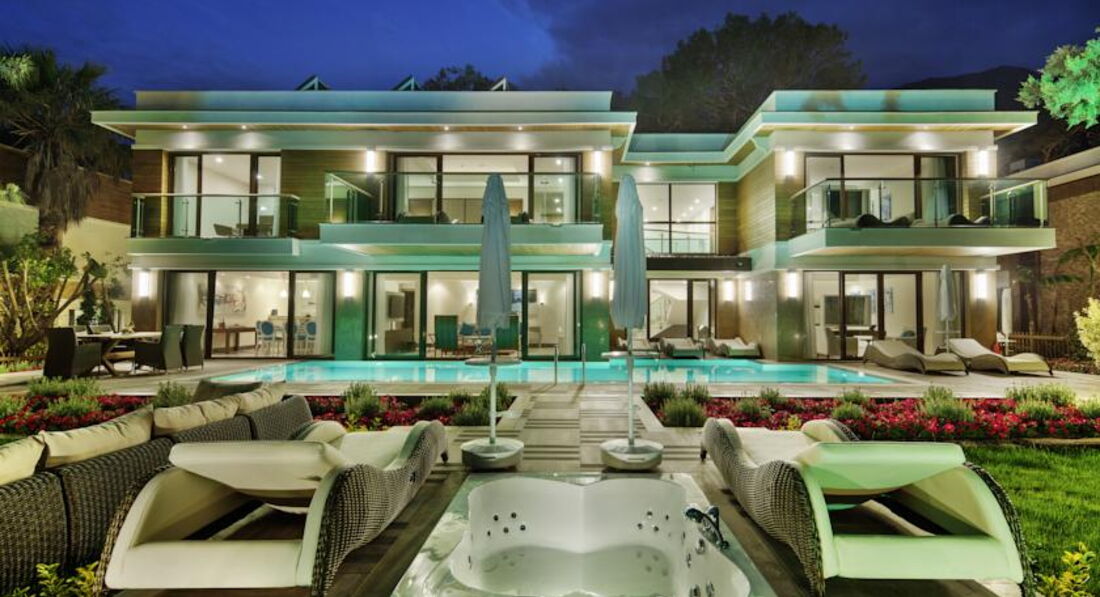 1 двоповерхова villa nirvana (індивідуальний басейн, вид на море та на басейн, 6 тв, парна, турецька лазня, сауна, на 1-му поверсі вітальня зі їдальнею, кухонний куточок, 2 спальні з дверима, 2 ванні, на 2-му поверсі 2 спальні з дверима, 2 тераси, 2 ванні, максимум 8 чол., 400 м2);