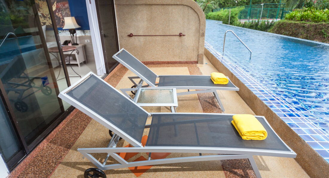 Лежаки у басейна с утра пораньше уже все заняты. А забыл сказать про комаров которые искусали
