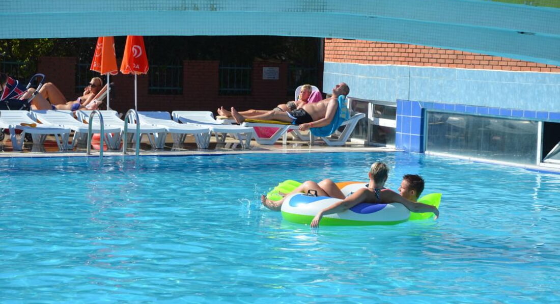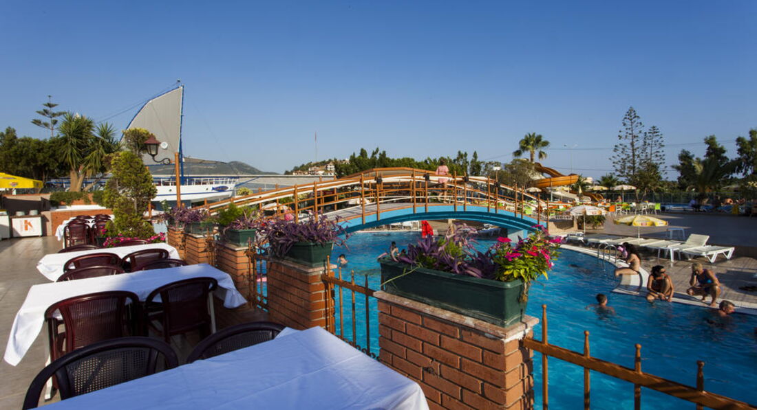 Между блоками А и Б находится релакс- бассейн, доступ +16, чтоб взрослые могли спокойно отдыхать, поэтому в комнаты, выходящие на бассейн старают не селить гостей с детьми. Ну и, вообще, для детей не особо отель, детская площадка маленькая, миниклуба не увидел. Да и по активности – отель скорее для спокойных, семейных пар; очень много пенсионеров-европейцев, в основном – немцев. Анимация – днем были на пляже, не видели, вроде аквааэробика была. Вечером – типа дискотеки, без русской музыки, практически без танцующих. Один раз выступал гитарист. Молодежь кучкуется и сама себя развлекает.
