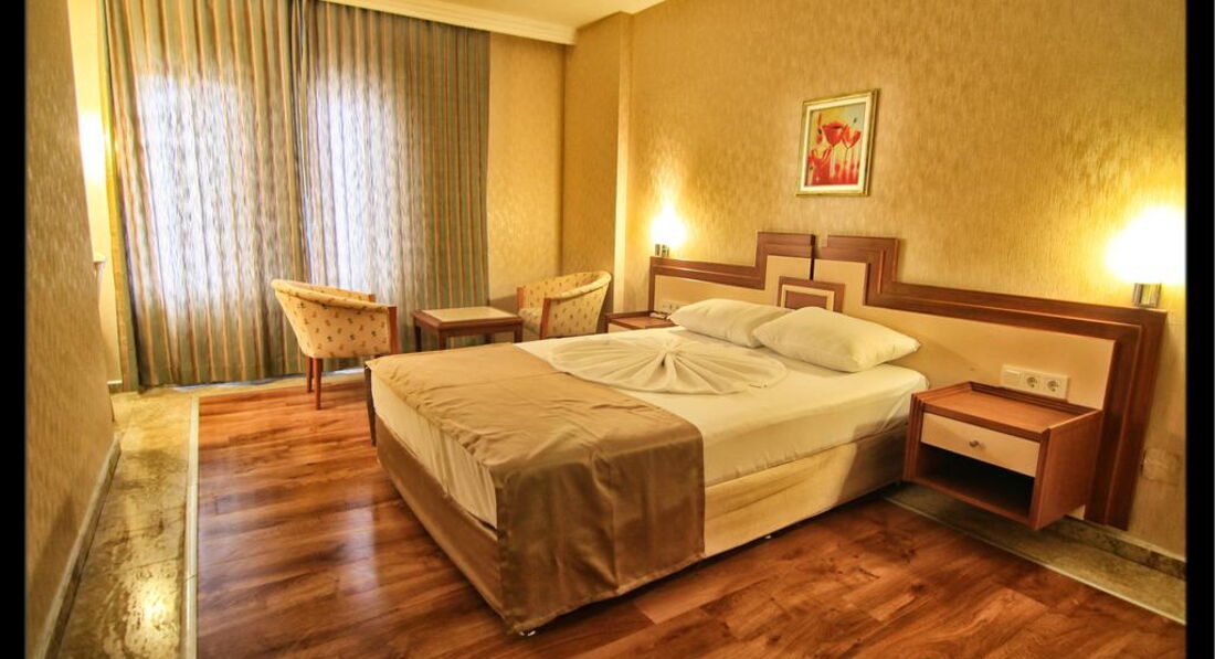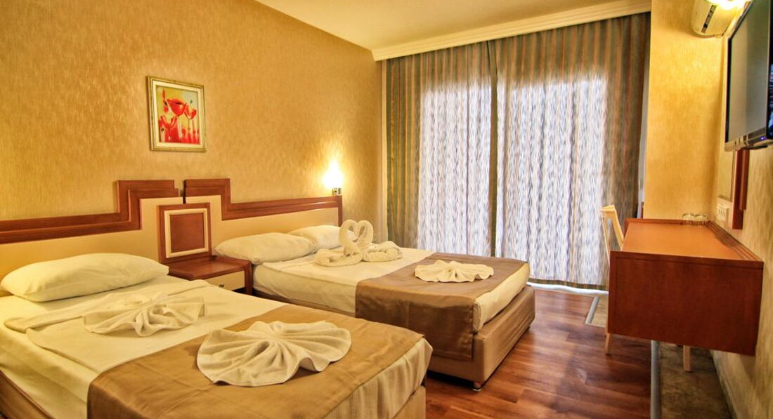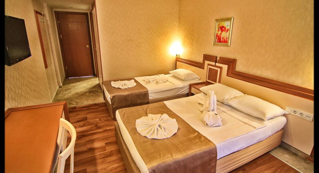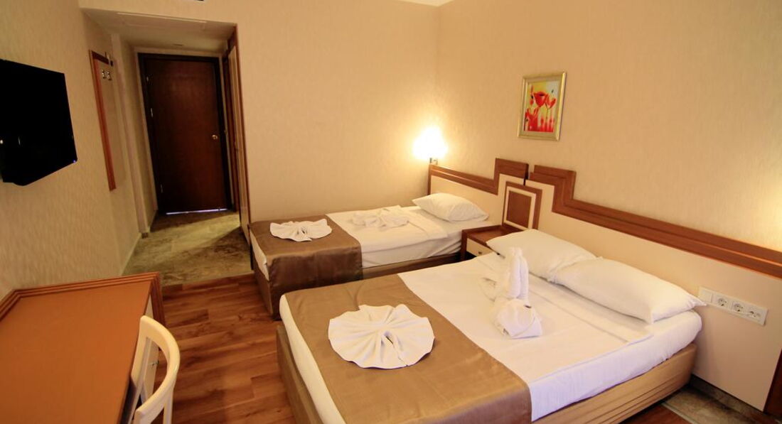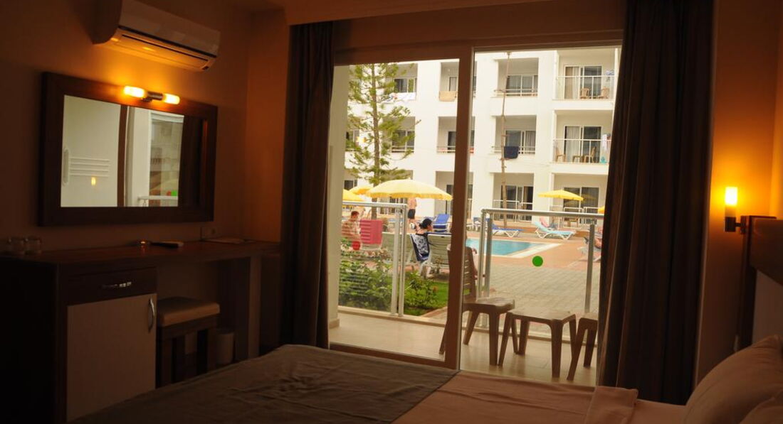 Встретили приветливо, сразу дали ключи и отправили на ужин. Номера вполне приличные, мебель не новая, но и не старая. Кровати широкие, 1,5 и 2-спальная. Уборка каждый день. В номере шампуни, гели, шапочки и тапочки. Насекомых и прочих живностей замечено не было. Балкончик стандартный, 2х2 метра. Вид на автошколу, другие отели и даже немного было видно море. На рецепшене очень хорошие и приветливые сотрудники, почти никто не говорит по-русски, однако объясниться можно. В самых сложных языковых ситуациях ребята включают на мобильном телефоне русско-турецкий переводчик. Правда, проблему с моим кондиционером за 5 дней так и не смогли решить, хотя каждый раз пытались для меня что-то сделать. WI-FI в номере был неважный, иногда просто не подключался – это на 3 этаже. На 5 этаже и в фойе работал вполне нормально.