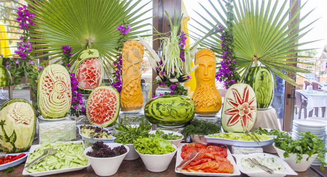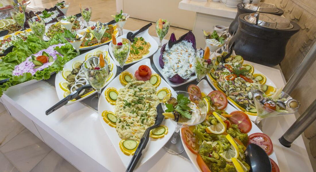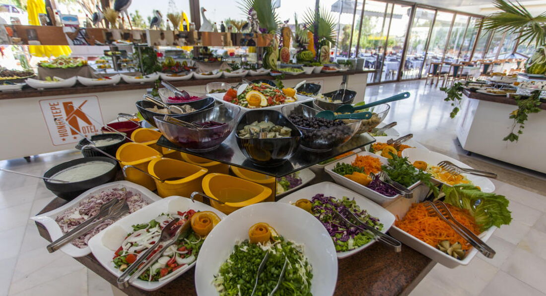 Питание - ОТЛИЧНОЕ! Много, Вкусно, Разнообразно! Утром - йогурт, мацони, курага, изюм, чернослив, халва, лукум, хлопья,шоколадные шарики, несколько видов сыра, колбас, омлет в виде рулета, блинчики, клубничное варенье, мёд, жидкий шоколад к ним. Булочки с кунжутом, - объедение. Овощи постоянно в свежем, солёном и маринованном виде-на любой вкус. Фруктов много, арбуз, дыня, яблоки, апельсины сладкие. Клубника была дважды, уже не сезон. Персики, абрикосы, слива, алыча-не всегда совсем спелые, но выбрать можно. На обед и ужин такая же картина - всем всего хватало! С 15 часов пекут лепёшки или хот-доги. В это же время мороженное бесплатно! В барах пиво ХОЛОДНОЕ и вкусное, вино белое, розовое, красное и другие напитки, на вкус не знаю какие.