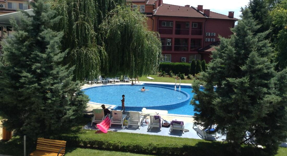 Основной плюс отеля, то что он находиться в парке. Есть небольшой басейн с лежаками. Соответственно есть возможность расположиться в парке и ходить купаться на пляж не оплачивая там лежаки. Мы на четверых несколько раз брали 2 лежака и зонт за 21 лев. Но потом решили что в этом нет мысла, тем более что дети переодически купались в бассейне. Море чистенькое, пляж рядом.