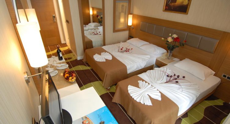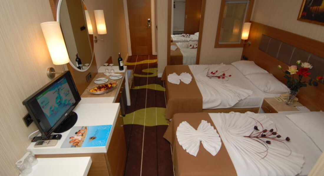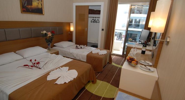 Отдыхали июнь-июль 2011, разместили сразу. Номер хороший не большой , но уютный: двуспальная и односпальная кровати, трюмо, ТV , холодильник - мини - бар, кондиционер. Туалет новый, все работает естественно отлично, душ кабина. Питание на убой. Беспроводной интернет. Спиртные напитки лично мне понравились. Кто употребляет молочку попробуйте там айран!! Обалденный! Персонал почти не говорит на русском, у нас не было проблем и общаться нам с ними не зачем было, они только приветливо улыбались и здоровались. Уборка проводилась ежедневно и смена полотенец то же. Развлекательные программы каждый вечер, обычно их посещают семьи и пары в возрасте, пару раз посмотреть можно. Территории нет совсем, но она и не нужна в принципе, тем кто без маленьких детей. Есть небольшой бассейн. Пляж мин 6-8 ходьбы подземный переход, оч удобно, пляж чистый, лежаков всегда предостаточно, все бесплатно зонтики, матрасы. Купаться лучше чуть левее от территории отеля там нет таких валунов. На пляже юпи, вода, кола, пиво, булочки. Хочу отметить ОЧЕНЬ хорошее расположение отеля!!! Район замечательный. Вокруг масса магазинчиков, ресторанчиков. Не далеко супермаркет МЕТРО, ходили туда отоваривались как по мелочам так и не очень.. Есть все от зубных щеток до шин, продукты естественно то же. Цены отличные! В лавках все гораздо дороже! Чуть по дальше есть торговый центр Аlanium.