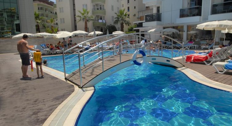 Приехали мы в отель ночью, заселили нас сразу, дали обычный небольшой номер, аккуратных с хорошим ремонтом, все отлично работало, и видом на проходную улицу, где всегда играла громко музыка и все гуляли веселились, а в дали виднелось море) Море от отеля находиться совсем недалеко, идти буквально 2-3 минуты, через подземный переход) Пляж замечательный, море лазурного цвета, чистое, тёплое, берег песочный, только в начале маленькие камушки, но это вообще ничего страшного, потому что на соседнем пляже вообще булыжники на дне валялись!! Всегда было много свободного места, шезлонги, матрасы и зонтики бесплатные, полотенце нужно брать с собой или покупать, есть бар, где дают безалкогольные напитки, продают мороженное и еду!! Мы не любители хлорки и по этому мы не ходили в бассейн, но в общем бассейн нормальный, небольшой, с одной горкой! Шезлонгов свободных практически никогда не было, если хотите полежать у бассейна, то занимайте их прям в начале завтрака и то, до обеда солнце попадает лишь на маленькую часть отеля и там не позагорать!! Еда была нормальная, но меня смутило только то, что если на завтрак были макароны, то на обед были эти же макароны, но пожаренные с томатами или т.п. Разнообразия в еде особого не было, но мы никогда не уходили голодными и всегда было что то вкусненькое) Напитки наливали хорошо,алкоголь нормальный не было ничего разбавленного!! Анимация была каждый день!! Персонал очень веселый, все к нам очень хорошо относились и заботились о нас) Русских в отеле практически не было, в основном европейцы.. Отель очень хорошо расположен, вокруг много магазинов, ресторанов и баров, все работает где то до 2х-3х ночи! До центра, где гора с крепостью, можно прогуляться, это займет где то 20 минут или поехать на такси стоимостью где то 7$ и добраться за 5 минут!! В центре достаточно много клубов, баров где очень весело и есть биг базар, где можно закупиться одеждой)) Мы ездили в клубы, на выездные дискотеки с аниматорами, цена одной дискотеки 10$, это за тобой приезжают, отвозят на дискотеку +один бесплатный коктейль и ночь отвозят обратно!! Мы ездили в SUMMER GARDEN CLUB, за нами приезжал открытый автобус в котором было много народу и играла громко музыка, все танцевали и веселись, это было круто)) Клуб клёвый,достаточно большой на открытом воздухе, народу очень много все веселятся и пьют) И еще мы ездили в Havana Club, этот клуб поменьше, но там так же очень весело)) Везде играла очень клёвая музыка!! Вообще в центре очень много клубов, но как нам сказали самый лучший клуб называется Робин Гуд, но мы туда так и не смогли попасть.. Я третий раз в Турции, до этого была в Сиде и Кемере и я могу сказать, что в Алании в 100 раз лучше чем в этих городах, ну по крайней мере мне понравилось намного больше) Всем советую этот отель кто хочет хорошенько повеселиться и отдохнуть)
