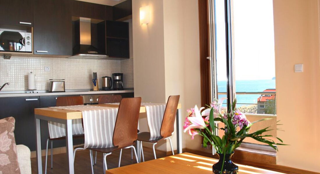 В отеле только аппартаменты (т.е. все номера с оборудованной кухней). При этом можно выбрать вариант отдыха с питанием в этом же отеле. Мы брали без питания и остались этим довольны, т.к. не были привязаны к часам работы ресторана. С питанием проблем не было: готовили сами и ходили в ресторанчики, вечером можно поехать поужинать в Обзор. Аппартаменты есть с одной спальней, двумя и тремя спальнями.