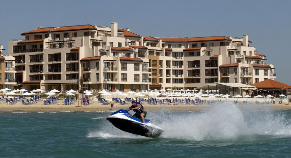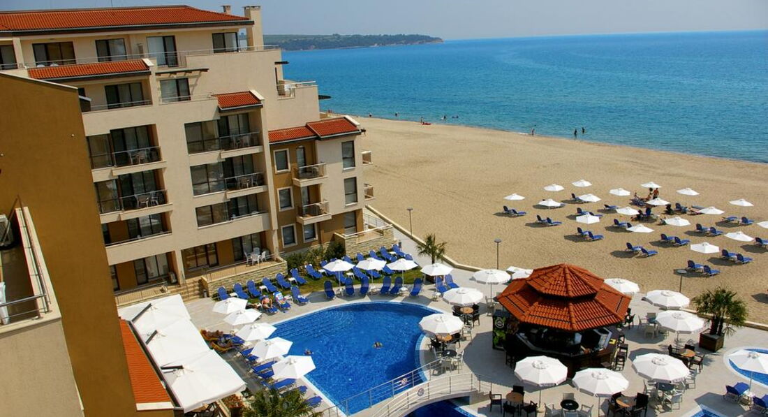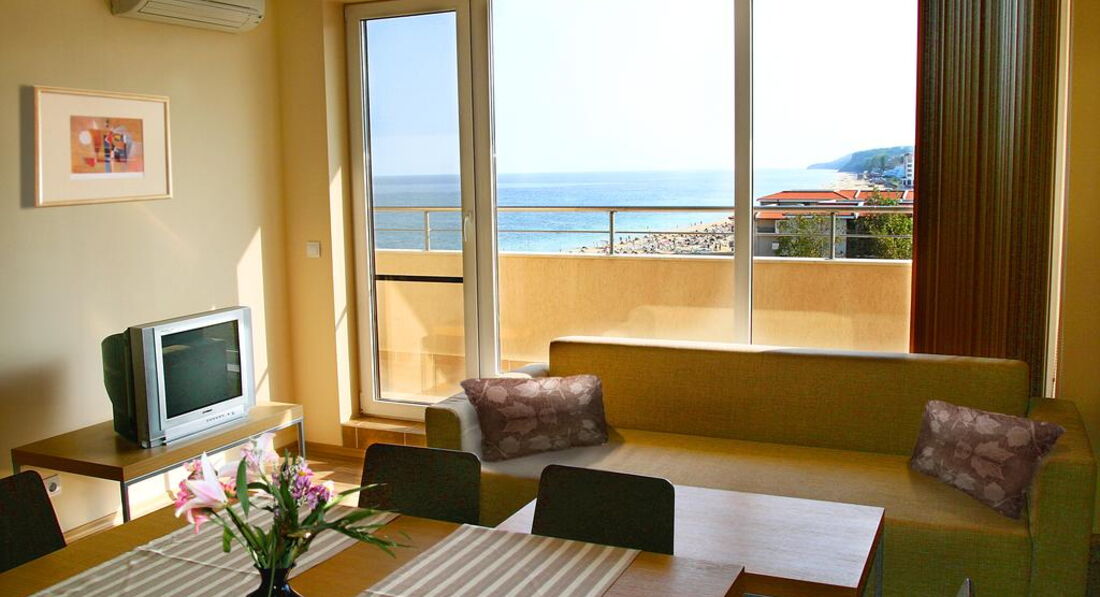Отель понравился. Рассчитан на спокойный комфотный отдых с детьми.Получили то, на что расчитывали. Выбирали исходя из расположения - первая линия, хороший пляж. И доплачивали за вид на море. У нас были аппартаменты с 1 спальней - выглядит как двухкомнатная квартира. Практически у всех аппартов с 1 спальней вид на море боковой. Уборка: ежедневная, но убираются не очень тщательно - мы и не настаивали. Если есть какие-то проблемы с уборкой - достаточно сделать замечание ил ивыскказать пожелание. Мы свою горничную не искали и не ловили (тем более они у нас менялись) - свои пожелания оставляли на ресепшн. Такое произошло только один раз. Все исполнялось моментально. В первое время делали лебедей из полотнец и ребенкиной пижамы - я удивилась, мне кажется для Болгарии это не свойственно. Туалетно бумаги всегда было с запасом:), как и полотенец. Нас отдыхало 2 взр и 1 ребенок. Как-то у нас в номере оказалось 6 больших полотенец и 4 маленьких. Лежаки на пляже не покупали( 3 лева за лежак и еще 3 за зонт). В сентябре (наш отдых 5.09-29.09) отдыхающих было мало и половину лежаков убрали, они находились далеко от моря, и везде была практически free zone. В сезон для сводобной от лежаков зоны отведено не так уж много места. Но, повторюь, никто не заставлял брать лежаки и ими пользовались от силы человек 5 - а отель очень большой. Мы брали на пляж полотенца из номера - никаких возражений не было. Отель состоит из 3 больших корпусов расположенных буквой П с максимальным количеством номеров с видом на море и еще 3 маленьких корпусов. Все они расположены вдоль пляжа. Пляж чистый и удобный - как и вход в море. Глубина увеличивается постепенно, но долго до глубокого места идти не надо. После 15 сентября количество персонала резко уменьшили и пляж практически не убирали. Пляж расположен достаточно далеко от г. Обзор - поэтому человеческий мусора мало, и набрасывали его только жители отеля. Но даже после 15 его было немного. Бассейны ( и взрослый, и детский) с бесплатными лежаками есть у каждого корпуса. Отель расположен в спокойном месте: с одной стороны море, с другой степь - 1км. Дорога далеко и не приносит никакого неудобства. основное достоинство этого отеля: расположение и пляж. А также возможность выбрать питание: было все - RO, BB, HB, FB. + все номера оборудованы комфортабельной кухней со всем необходимым и в плане техники, и в плане посуды. Мы брали BB, так как уезжали на неделю путешествовать по стране и хотели побольшеболгарской кухни. А ребенку периодически нужны были домашние супы - для этого и брали аппарт. Итак, питание в отеле. Завтрак с 7 до 10 всегда такой: яйца (омлет 3 вида + обычное вареное) сосиски и бекон. Кисло мляко и сладкий йогурт с 4 видами сухого завтрака и 2-3 видами сухофруктов. От 2 до 4 видов сыра. 3 вида колбасы + ветчина. Фрукты от 0 до 4 видов. Овощи: оливки маслины помидоры огурцы лук салат- всегда; капуста морковь кукуруза и тп - иногда. Можно самим приготовить тосты. Хлеб для тостов, булочки. 2-3 вида сладких кексов. 4 вида тортов каждый день - но приносят их так: заканчивается один торт, приносят другой. И в упаковках масло, плавленный сыр, джем, мед. Мы ничего с звтраков не брали. Фрукты можно брать совершнно спокойно, не пряча ни в какие сумки. Развлечения: Спорт на пляже. Стетчинг на пляже. Наст. теннис и мини-гольф за плату - 5 левов (В сентябре стола уже не было, а поле для мини-гольфом ч