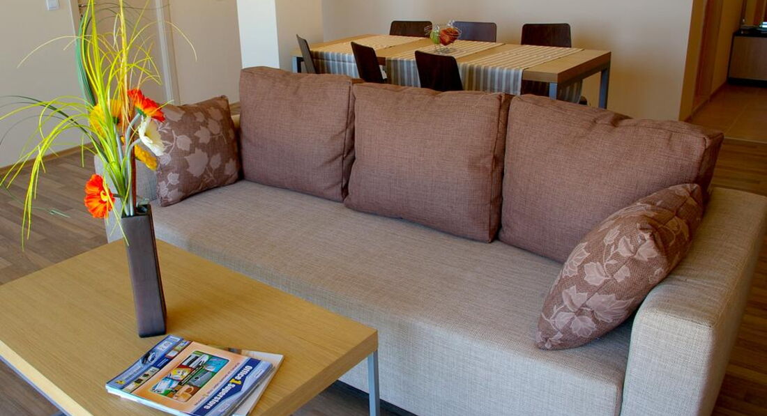 One Bedroom Apartment Mountain View/Side Sea View/Sea View/Exclusive Sea View - спальня з двома односпальними ліжками та вітальня з суміжними дверима, з розкладним диваном, обіднім столом та кухонним куточком (холодильник, електрочайник, кавоварка, тостер, мікрохвильова піч) , духовка, посуд), макс. 2 дор. + 2 дит. або 3 дор., 45-60 м2;
