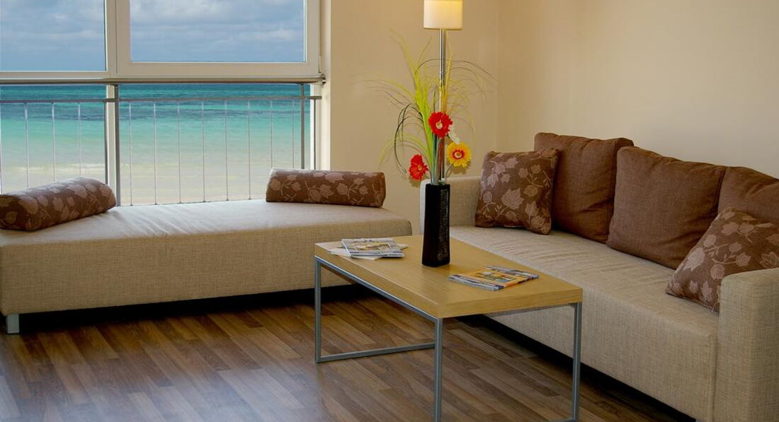 Three Bedroom Apartment Side Sea View / Sea View - 3 спальні з двома односпальними ліжками в кожній та вітальня з суміжними дверима, з розкладним диваном, обіднім столом та кухонним куточком (холодильник, електрочайник, кавоварка, тостер, мікрохвильова піч, плита, духовка) ), макс. 6 дор. + 2 дит. або 7 дор., 95 -105 м2.