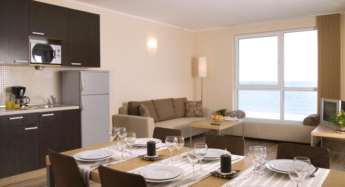 Номер превзошел все ожидания. Состав нашей тургруппы был: две мамы, два ребенка - соответственно мы брали номер с двумя спальнями. Наверное, скудность изначальной информации была недоработкой нашей турфирмы - но в данном случае это был положительный момент! Нам обещали две спальни, удобства, балкон, вид на море и оборудованную кухню - на всякий случай мы рисовали себе все это в самом скромном виде. В итоге, заселившись, мы не могли поверить, что такое возможно (по крайней мере в Болгарии)! Правда, сезон только начинался и , допускаю, есть варианты. Общая площадь нашего номера приближалась к 90 - 100 метрам, Основная часть - гостиная/кухня , метров 25-30, с обеденным столом на 6 персон, оборудованной кухней (если пофантазировать - для идеала не хватало посудомойки и стиральной машины), диван, кресло, телевизор, выход на балкон - плюс огромное окно в пол-стены с видом на море (причем исключительно море, поскольку сам корпус стоит практически на границе пляжа). Плюс две (небольшие) спальни - в одной двуспальная кровать, в другой - две single впритык, два сануузла с душем (один у спальни "двуспальной" , второй - при входе), два балкона - один небольшой из "двуспальной" спальни с видом на бассейно и sideseaview, второй большой с двумя выходами - из второй спальни и из гостиной – на море. Все новое, неушатанное, в стиле "скандинавский минимализм" - мы такое любим :) По телеку – один русский канал, много хороших англоязычных.