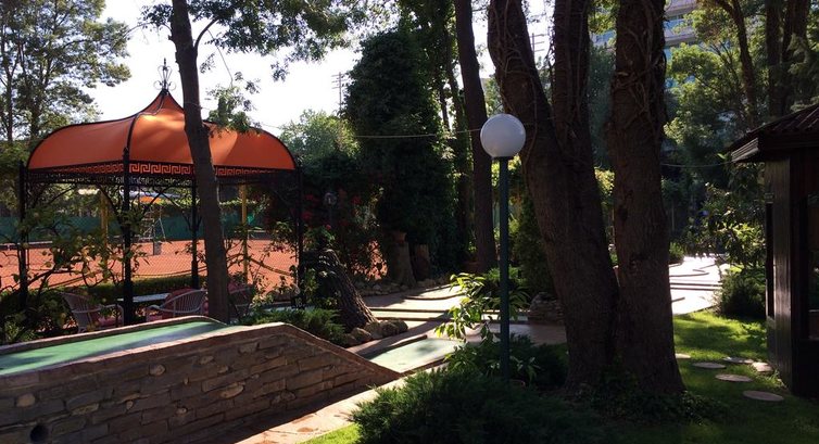 На территории отеля расположены теннисные корты и мини-гольф. Сама территория не большая, но очень красивая. Действительно, как маленький оазис. Даже когда проходишь мимо, самого отеля не заметно, весь утопает в зелени. Маленький, уютный, тихий. Wi-Fi в отеле бесплатный, у нас даже в номере был, т.к. модем близко стоял. До моря достаточно близко, пляж хороший, песок и пологий вход в море.