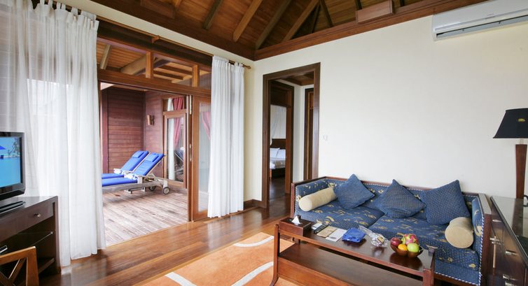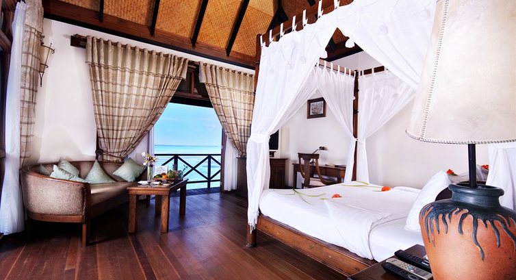 21 Deluxe Water Villa (63 м², макс. 3 або 2+1 дит. від 7 до 12 років). Бунгало, що окремо стоять у водах лагуни, спальня із зоною вітальні, ванна, індивідуальний спуск у воду, велика тераса з шезлонгами, набір для приготування чаю та кави, CD-плеєр.