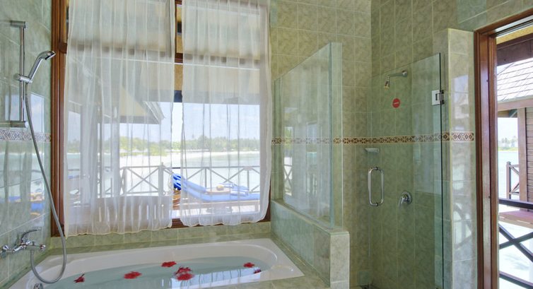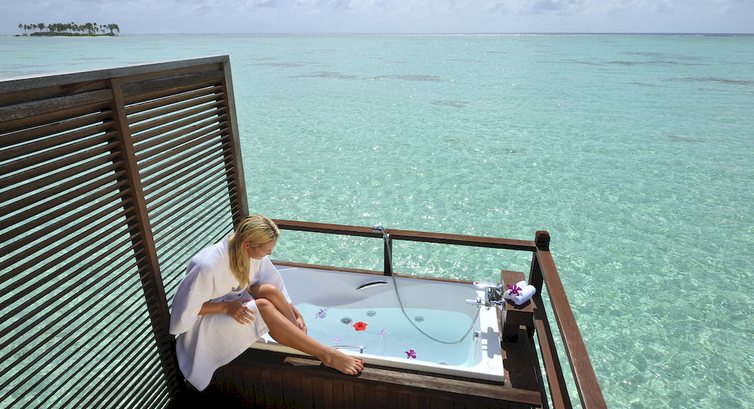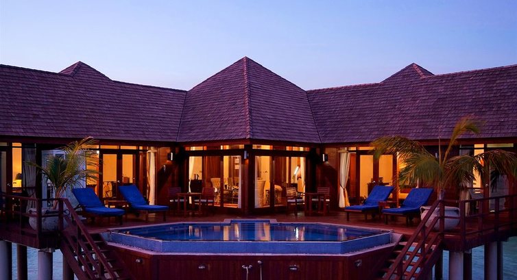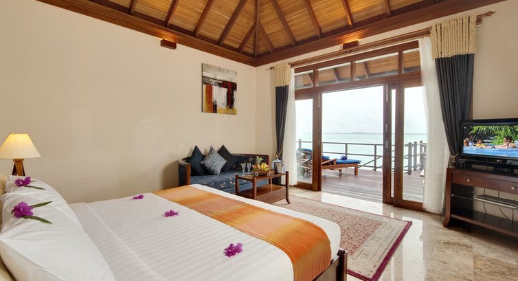 13 Jacuzzi Water Villa (81 м², макс. 3 або 2+1 дит. від 7 до 12 років). Окремі водні бунгало з джакузі на терасі, спальня із зоною вітальні, набір для приготування чаю та кави, CD-плеєр, індивідуальний спуск у воду.