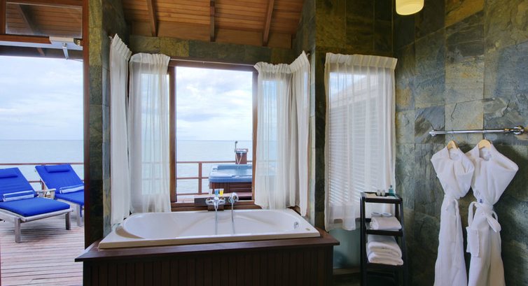5 Honeymoon Water Villa (122 м², макс. 2 чол., третій – на запит). Водні бунгало, спальня і вітальня зі скляними стінами на 3 сторони, що окремо стоять, прекрасний панорамний вид на океан. Джакузі, індивідуальний спуск у воду з тераси.