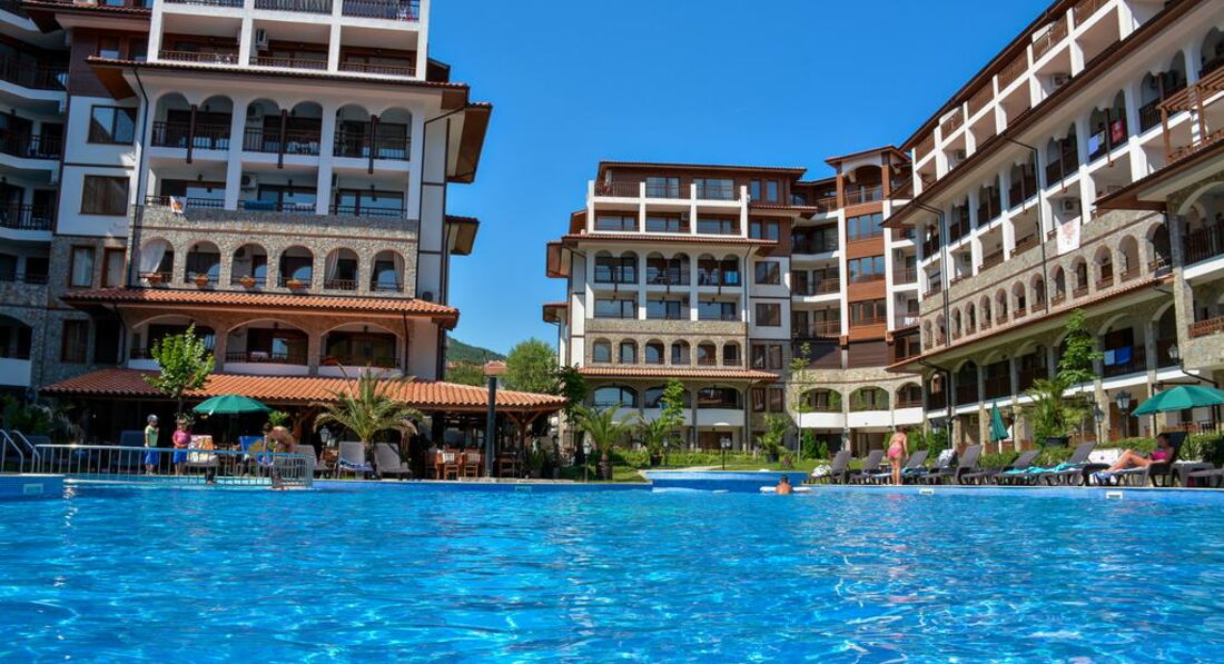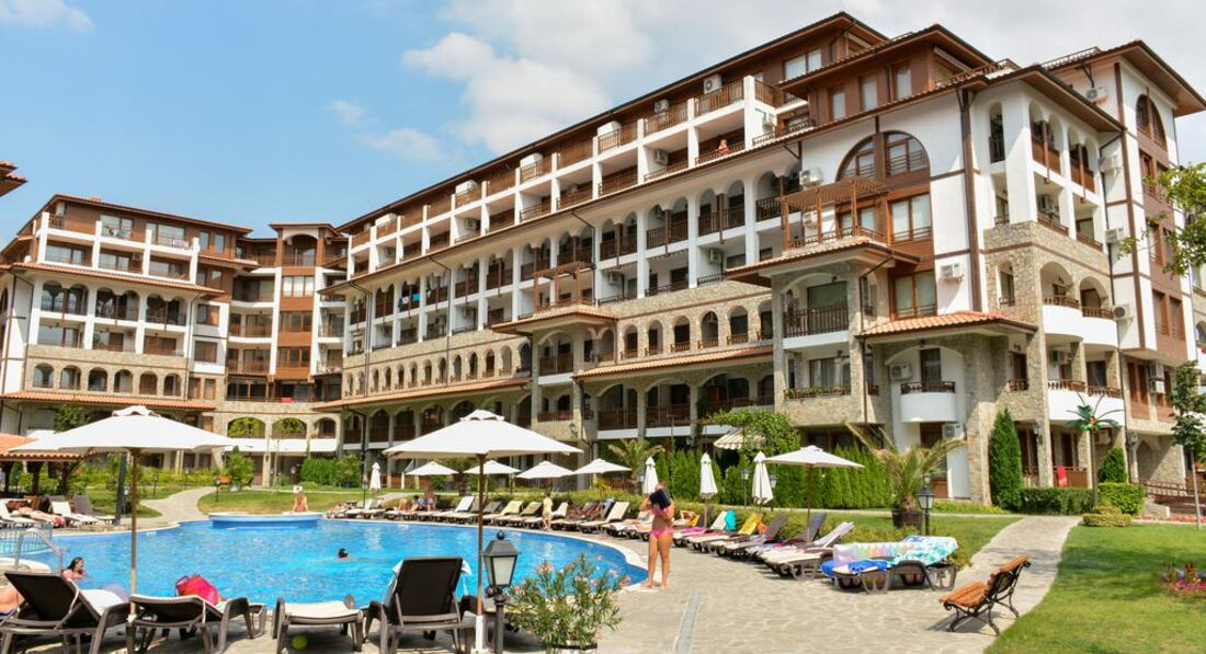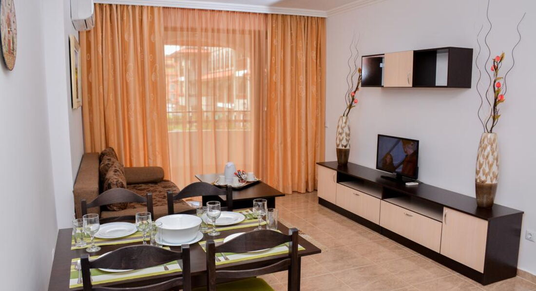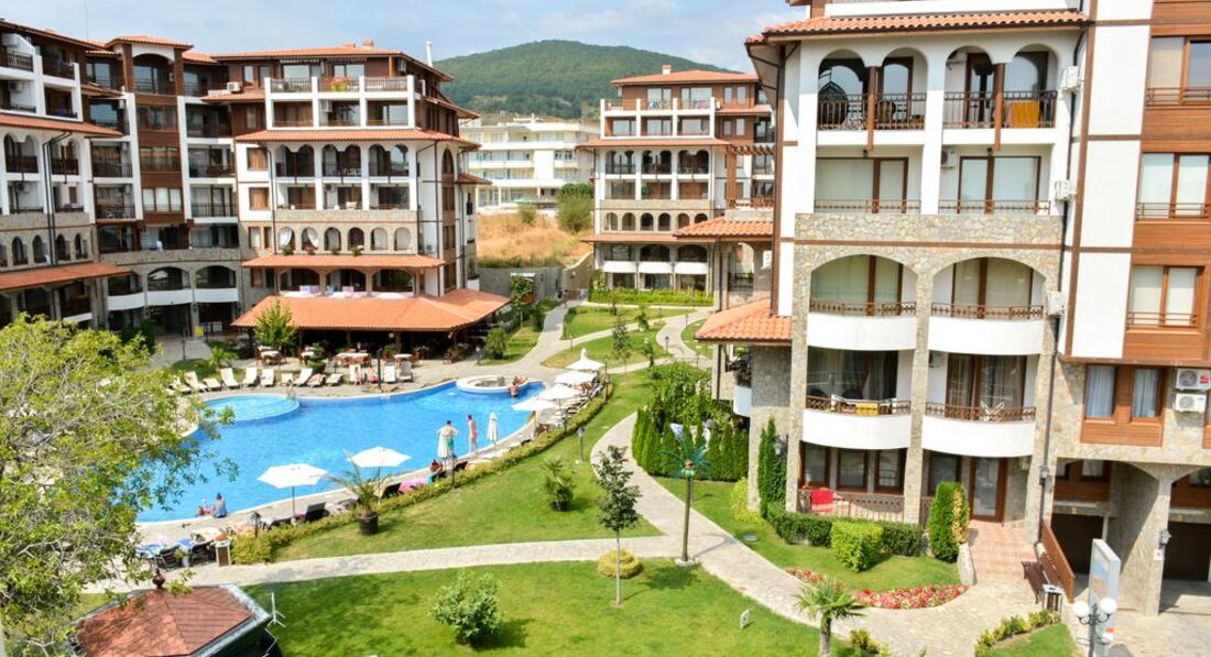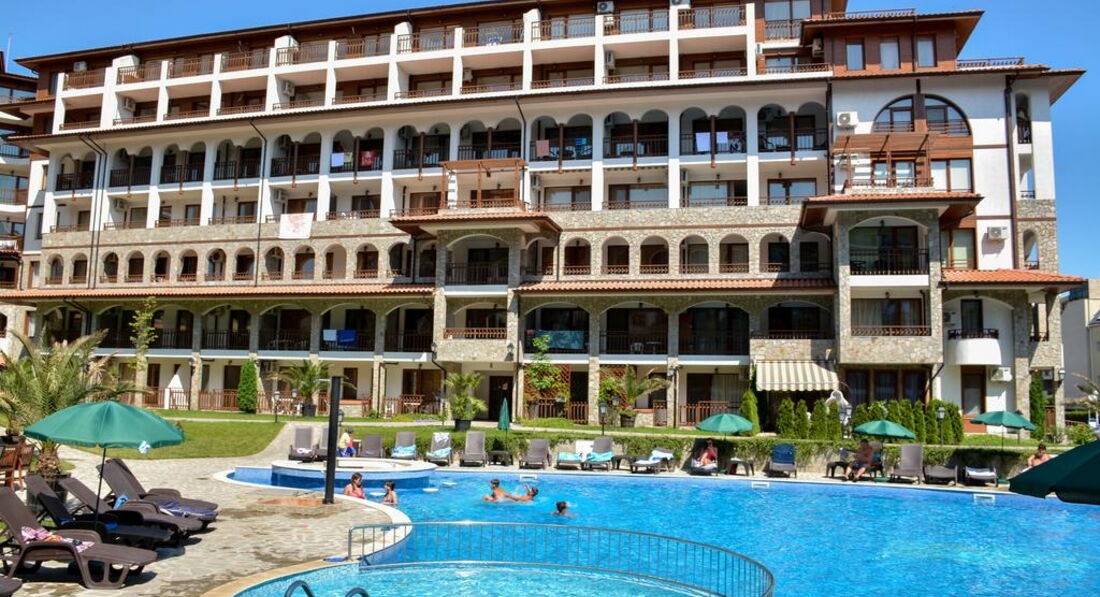 Отель новый, все новое, чистое. Принадлежит к Диневи групп (крупнейший застройщик Болгарии, базируется в Св.Власе). Мебель новая. Кухонная техника вообще не юзаная. Стиралкой мы первые видимо начали пользоваться. Все в номере было сразу, донесли по запросу фен и гладильную доску с утюгом. У нас были Угловые аппартаменты на 6 этаже, на три стороны. Вид шикарный. Но сначала было ветренно и за счет этого сквозняка охлаждали номер. Так как кондер только в кухне-гостиной. В спальне нету, хотя выводы есть. Ванная небольшая но полноценный душевой уголок, хотя, немного протекал у стены. На полочке места мало, но в спальне и тумбыи комод с зеркалом. Территория ухоженная, целый день ее драют и подстригают. На ресепшене очень адекватные менеджеры, по русски говорят и понимают хорошо, девушка-менеджер не очень. В ресторане при отеле ни разу не питались, не знаю даже почему))) только кофе пили, но по вечерам там работал ресторан и много приходило с улицы. Площадка детская есть, небольшая. Бассейн большой, чистый. Места всем хватало.