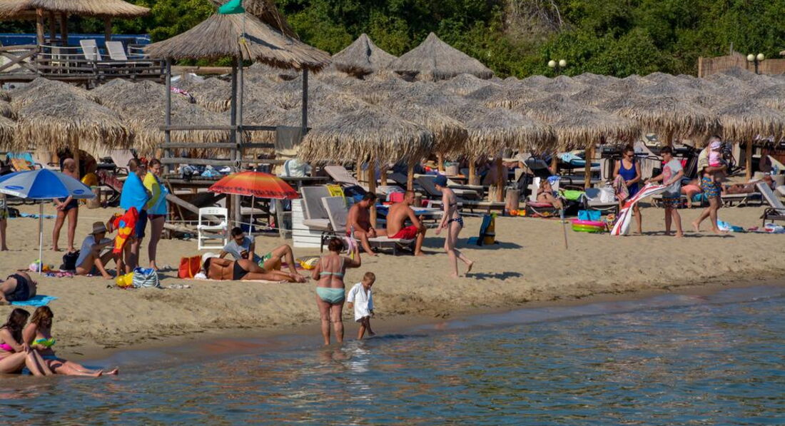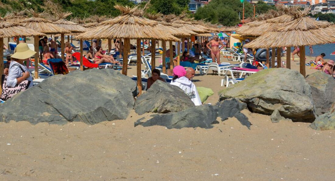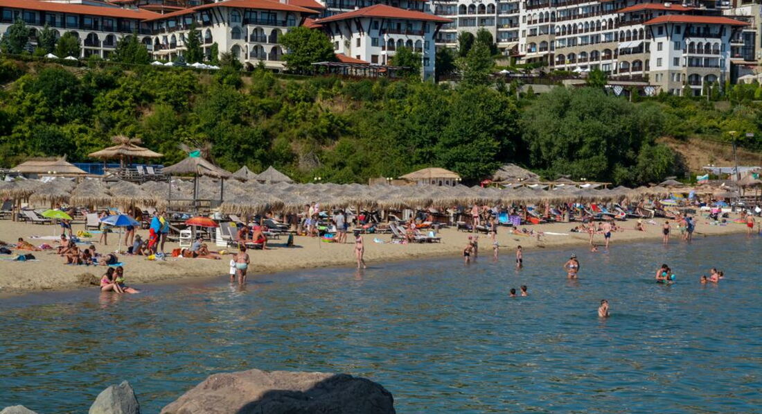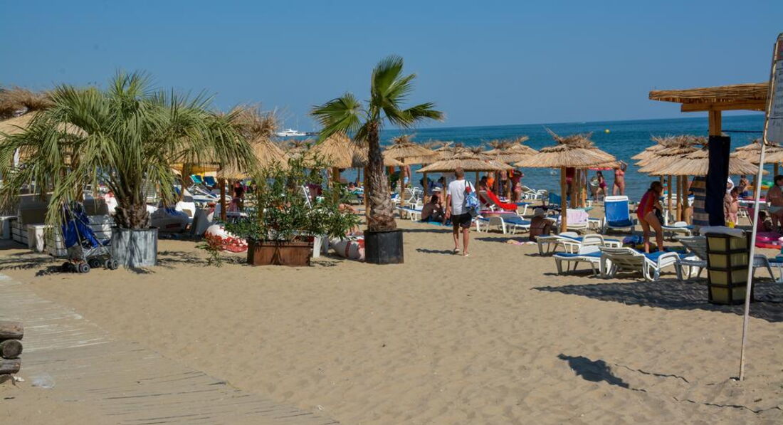 До пляжа идти минут 5-7. Пляж песчаный, при входе где-то немножко мелких камушков, где-то песок. Море очень теплое и по утрам чистое. Волны были все время нашего отдыха, но мы отлично покупались, ребенок был счастлив. Лежаки и зонты платные, около 8 лев, по-моему. При входе на пляж маленький ларек со всем необходимым для пляжа, и зонты, и полотенца, и мячи, и формочки. В общем все можно купить там для детей,а не везти с собой. Кукуруза на пляже стоит 2,5 лев, стакан с клубникой, малиной или черешней 5 лев. На пляже так же в основном русские и болгары.