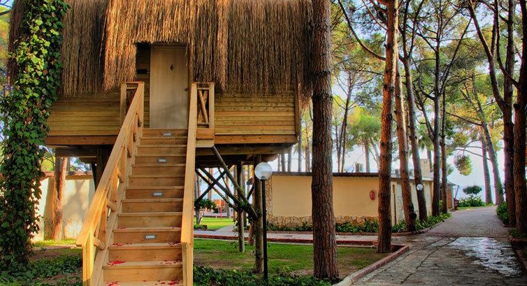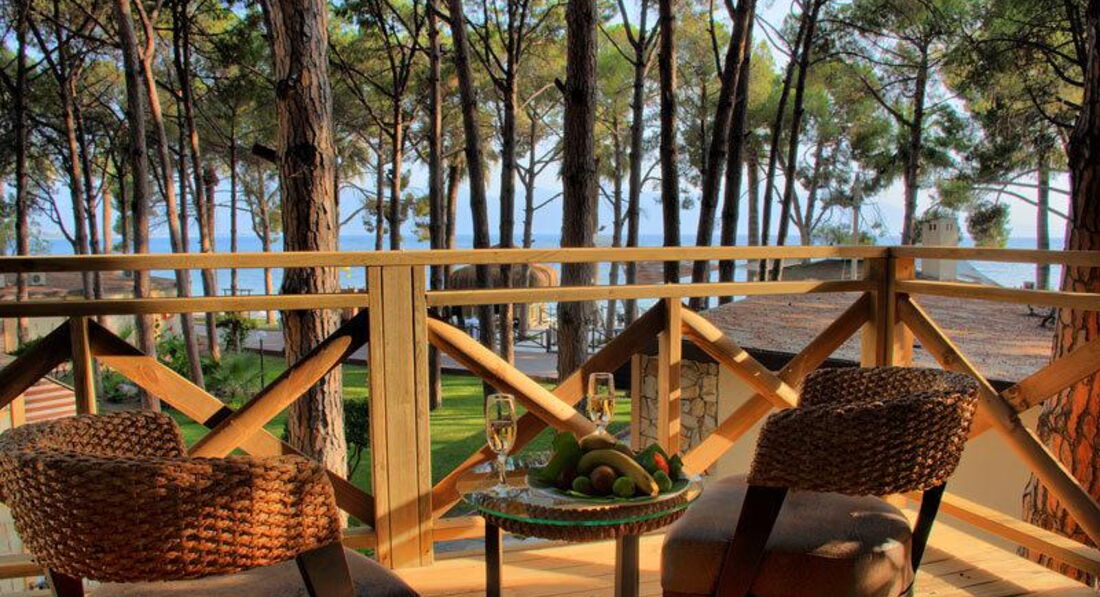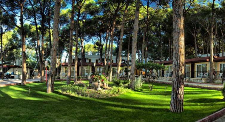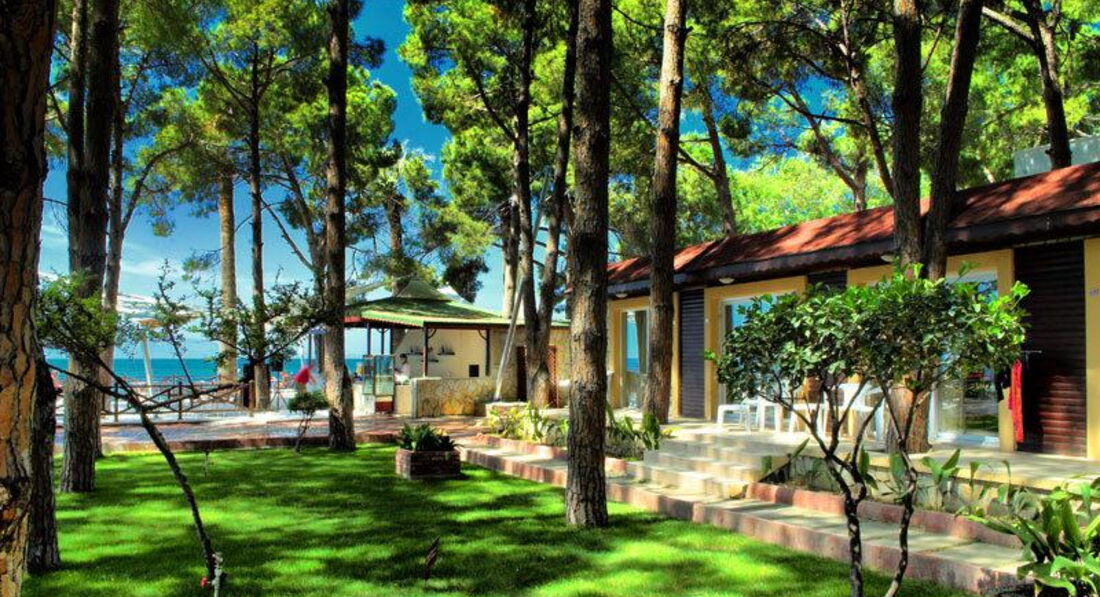 Территория отеля, вроде, маленькая, но не крошечная. Нам очень понравилась. Роскошь этого отеля – сосны. От того, что растут огромные сосны, в самую жару находиться на территории очень комфортно.