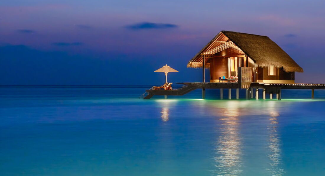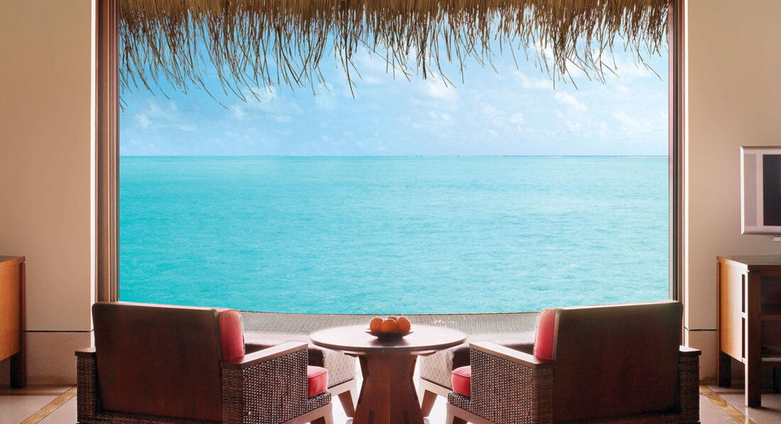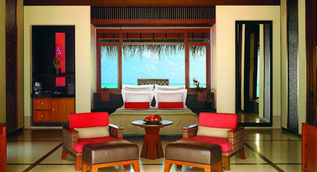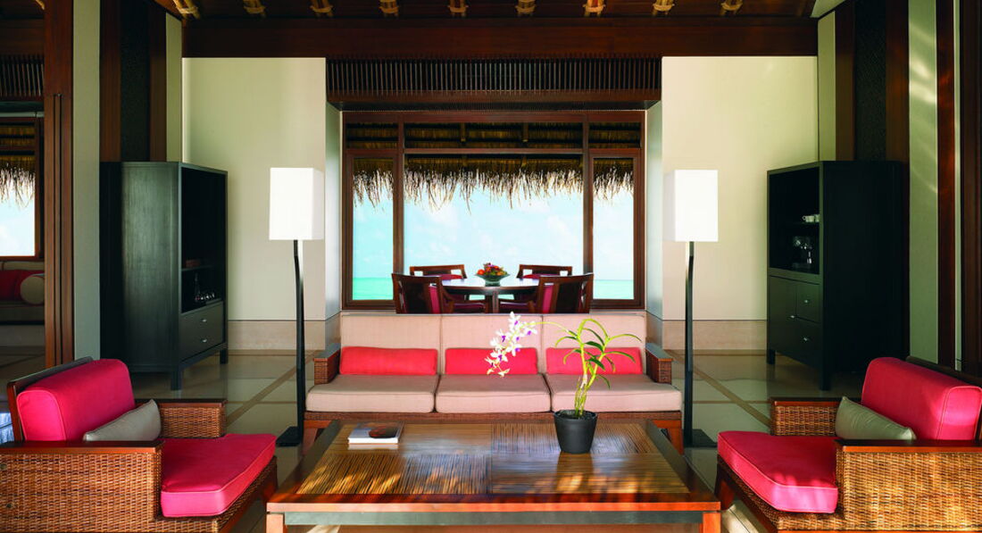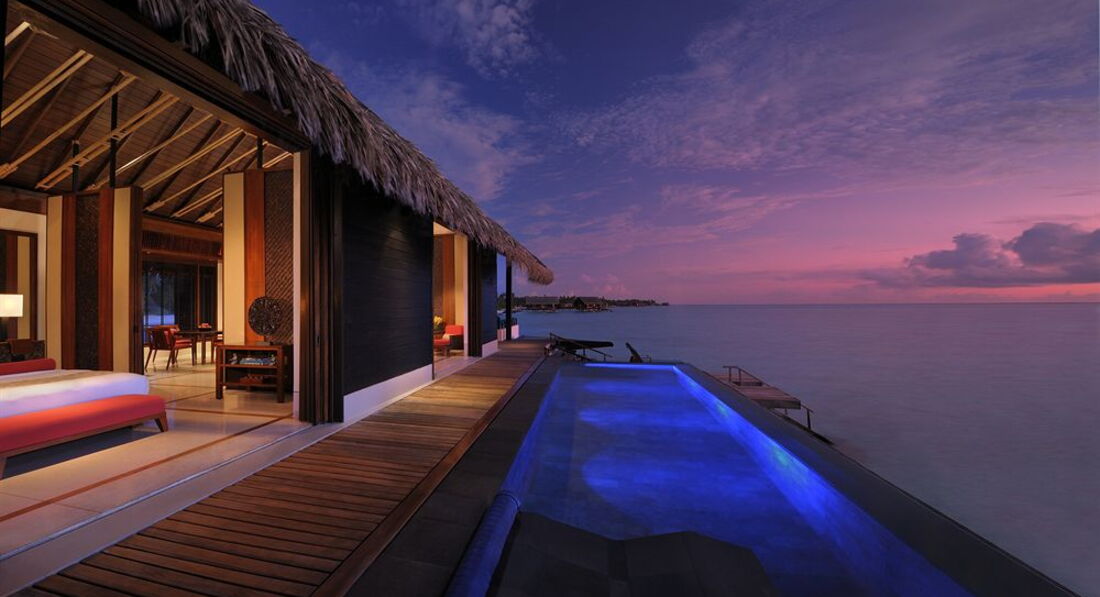 2 Grand Water Villa (241 м², макс. 3 або 2+2 чол.). Простора водяна вілла. Спальня, вітальня, джакузі (13 м²) з видом на океан, відкрита тераса з басейном (23 м²), шезлонгами та відпочинковою зоною, натягнуті над водою гамаки з м'якими подушками. Можливість користуватися власним електромобілем (баггі) для пересування островом, пляшка шампанського по заїзду. У разі розміщення з дітьми батькам необхідно підписати спеціальну форму (Liability Form).
