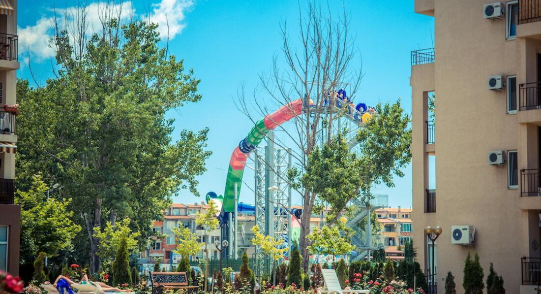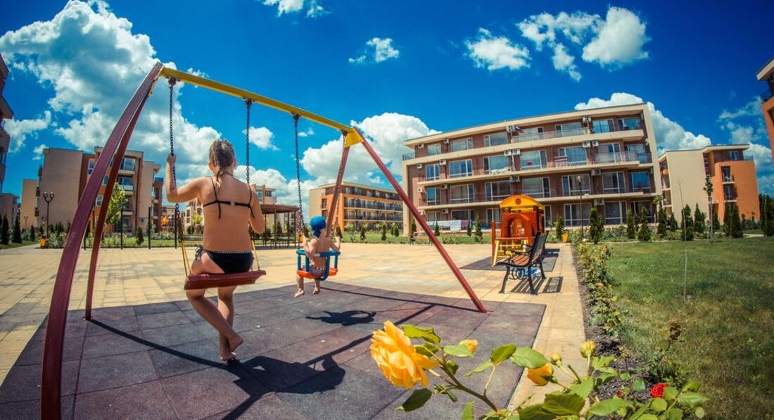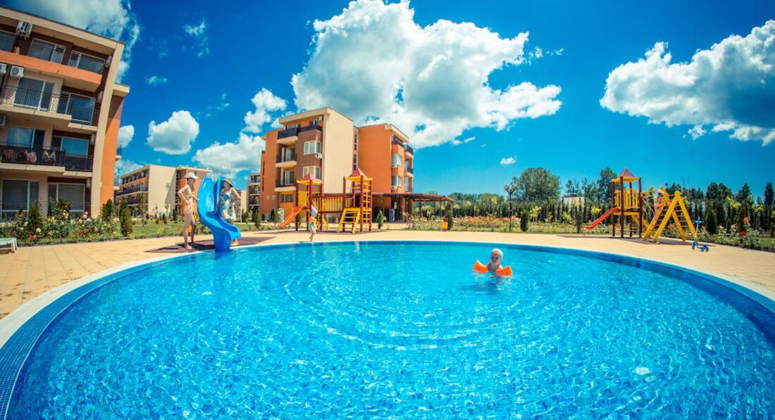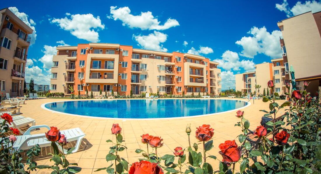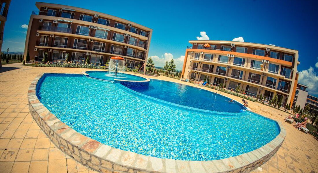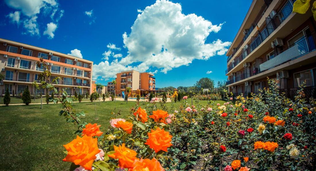 Это не отель. Это большой комплекс апартаментов. Проживающие в основном русские, украинцы, белорусы. Территория очень чистая, вся засажена розами, три или четыре открытых бассейна. До моря минут 20-30 пешком. На территории есть кафе и магазин. До супермаркета и обменника минут 10-15. Персонал хорошо говорит по-русски..да и везде там все понимают и говорят по-русски. Мы жили в однокомнатных апартаментах. Хороший wi-fi..только каждый раз нужно было вводить логин и пароль.. Очень порадовало наличие большого числа каналов..русских каналов..как дома. Да и вообще общее впечатление..как дома. Особого колорита от этой страны ждать не нужно..это исключительно пляжный отдых на черном море. Особо посмотреть нечего, тратить деньги не на что. Покушать на двоих 30-40 евро..не помню уже курс, чтобы сказать в левах. Много недорогого и хорошего алкоголя: вино, бренди. Очень удобно отдыхать с детьми..там оооочень много детей. Цены на жильё невысокие, на продукты такие же как в России. Отличная альтернатива нашему черноморскому побережью.