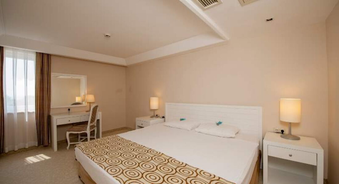 Отдыхала с сыновьями 9 и 18 лет. В Одессе чартер задержали - это стало плохой традицией... упрек в сторону МАУ! Зато в солнечной Турции все как всегда на высоте! Сразу встретили, с комфортом доставили в отель (небольшой бусик, всего 3 семьи). Приветливо встретили и сразу же разместили. Номер в главном корпусе, чистый, уютный, просторный. Немного смутила поначалу стеклянная стена в душе))) - я с 2-мя сыновьями на отдыхе). Ближе к ночи ждал неприятный сюрприз: шум установок под окнами, музыка из отеля через дорогу... Утром обратилась на ресепшен, предложили номер на выбор в бунгало. Без возражений, без доплаты, без проблем! Спасибо большое сотрудникам ресепшена! Очень внимательные и приветливые! Номер оказался очень хороший! Прекрасный вид, лужайка, недалеко главный ресторан и лобби, лучше не придумаешь!