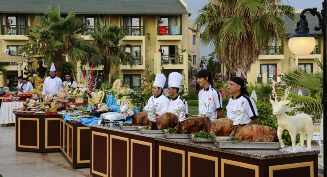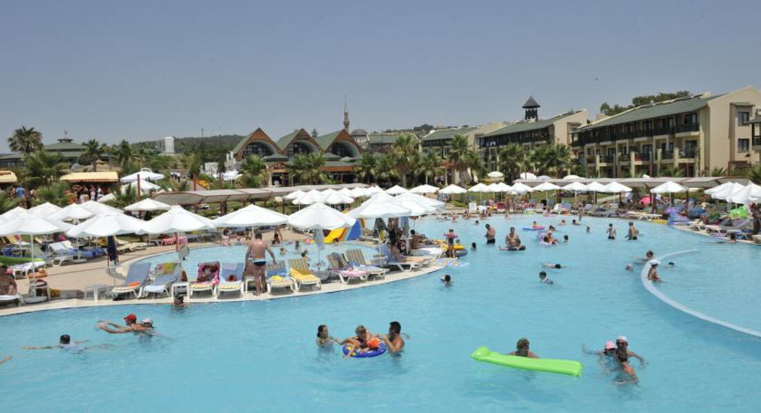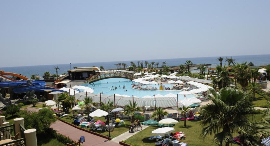 В Турции отдыхаем уже не в первый раз, и это было нашим первым разочарованием... приезжали с мужем и дочерью 12 лет. Холл отеля просторный, номера старенькие, балконы большие, плесень местами имеется))) Территория отеля большая, ухоженная и красивая, постоянно моют, убирают, вежливый персонал, что является одновременно и минусом. Когда ты пытаешься вздремнуть в обед, а вокруг тебя гремят горшками и пытаются пообщаться приветливые сотрудники, это начинает раздражать. Анимации для детей постарше нет как таковой. Ребёнок несколько раз играл в дартс и катался на банане (за 10$). А, есть стандартная детская дискотека с однообразным набором музыки. Имеются водные горки (на средней катайтесь Осторожно- мы сильно отбили копчики, несмотря на то, что опытные любители водных развлечений). На ночных диско для взрослых нет ни души. Взрослые аниматоры молодцы, с замечательным чувством юмора, благодаря им можно хоть как-то веселиться: достаточно динамичный и веселый дартс утром и в обед, водное поло днём, вечерние шоу (с их участием намного лучше, чем с приглашёнными «артистами»), с ними же по желанию можно съездить на диско в город. В самом отеле в принципе очень шумно, в особенности, во время трапез. В какой-то момент моя семья стала ходить к закрытию вечером и открытию Ресторана утром, я и вовсе перестала посещать едальню на 4й день, из-за вечных воплей и криков детей находиться там было, мягко говоря, не комфортно, а если прибавить, что детей там ооооооочень много... Ах, да, про огромные очереди за чем-то вне ресторанного меню не зря написали. Фруктов много, но какие-то они дубовые все, проще выйти и купить вкусные на рынке, а не стоять за ними полчаса. Ресторан ля-карт можно посетить один раз за весь период проживания, но оно того не стоит. Такой подачи и трэша я не видела нигде))) Как и таких голодающих с Поволжья людей-здесь никуда не подевалась старая русская традиция завалить столы всякой всячиной... смотреть на это спокойно можно, но первые пару дней. Не от обжорства ли у многих возникли проблемы с «ротавирусом»?))) алкоголь тоже паршивый. Поэтому мы часто выезжали за территорию отеля до Алании (на такси с ожиданием 6 часов туда и обратно за 40$), до Авсаллара чуть меньше и ближе, там же справа от большого центрального магаза есть милый ресторан с вкуснейшими стейками). У гида можно записаться на сафари на квадроциклах и багах, ехать от отеля 5-7 минут, трасса не опасная, ездили аж два раза за время поездки. В общем, если сравнивать особо не с чем, то вам понравится, но за эту цену можно найти куда более приятные и спокойные места и поближе к аэропорту) всем отличного отдыха!))