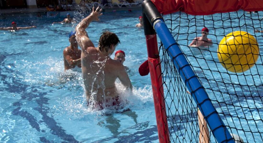 Анимации нет. На пляже волейбол, в бассеине поло.