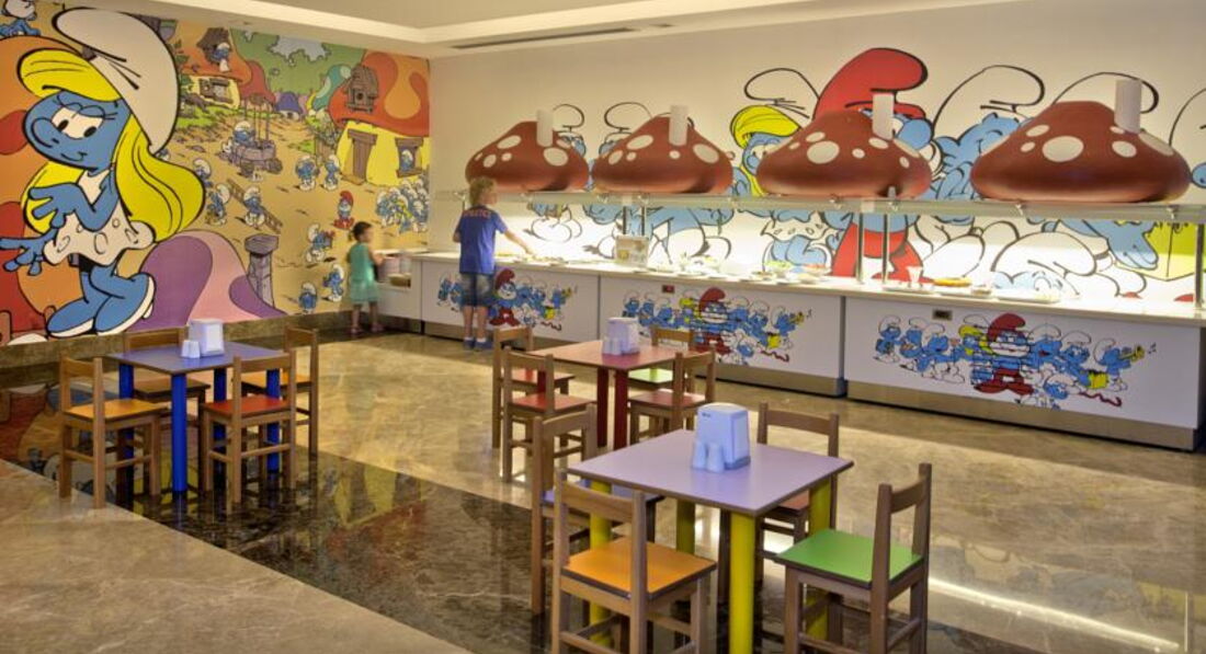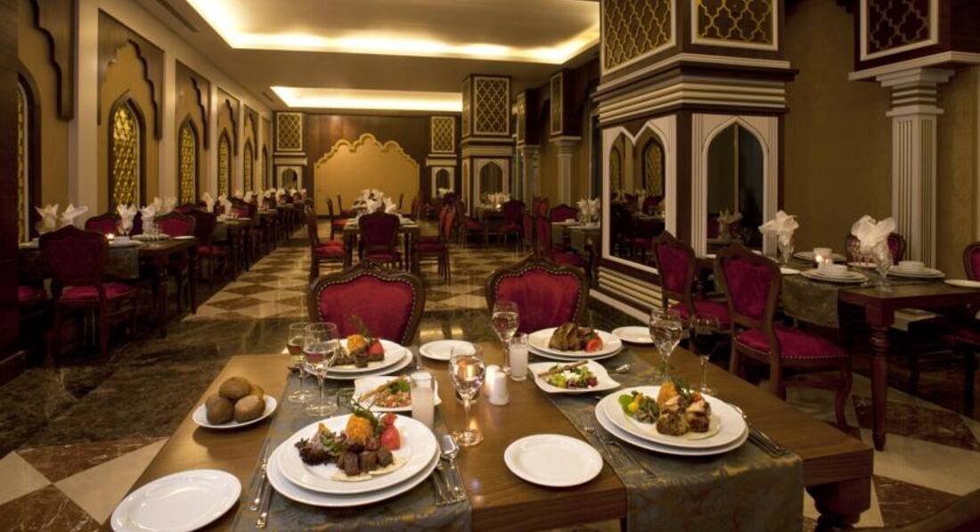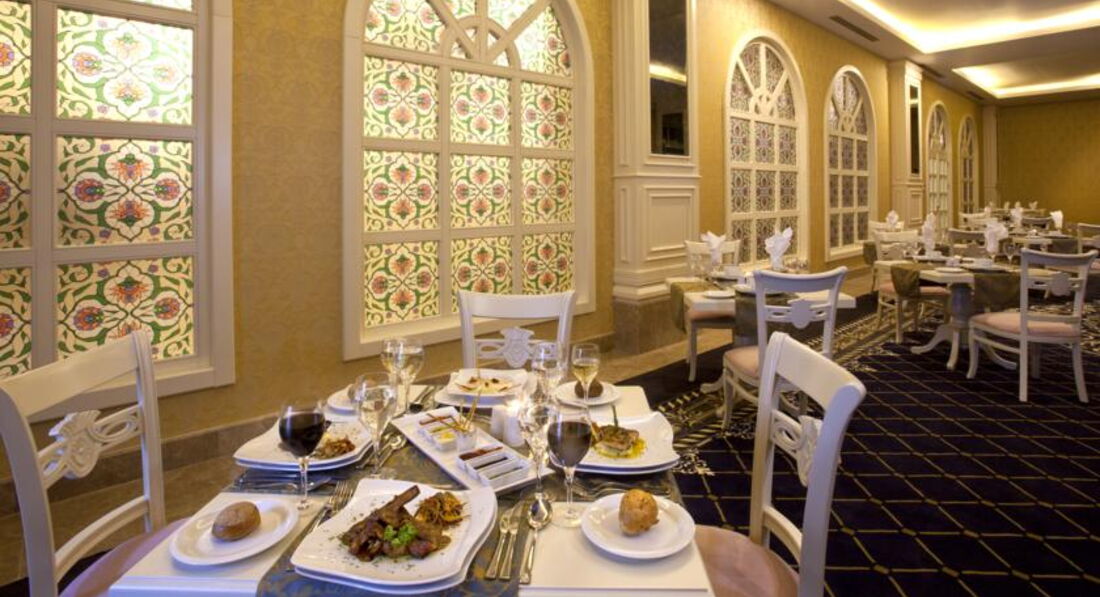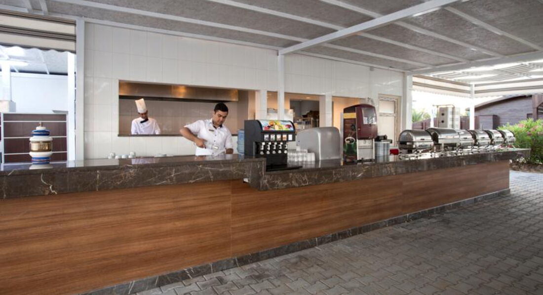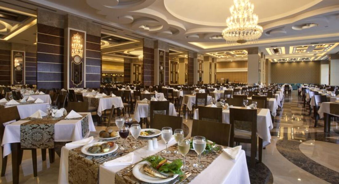 Ресторан огромный, народу тьма. Если приходишь к отрытию, огромные очереди, если приходишь на 40 мин позже, то сложно найти свободное место на троих. Официанты не справляются с таким количеством людей, убирают столы не очень быстро и не очень тщательно, после кого-то сидеть потом неприятно. Мой совет, лучше приходить к открытию, и посидеть за столом с чашкой кофе, пока очереди рассосутся. Наши соотечественники как будто из блокадного Ленинграда, толпятся в очередях, набирают огромные тарелки всего, как будто закончится еда и им не хватит. Все подносы пополнялись регулярно, не было такого, как читала в других отзывах, что одна рыбка в руки, всего валом, Другой вопрос, что качество еды оставляет желать лучшего. Все жутко острое, перчоное, то ли это специф. турецкая пища, я не знаю, но кушать было невозможно. Вроде всего валом, а выбрать нечего, особенно для ребенка, только на ужин всегда были типа соусов или тушеное мясо с овощами и картошкой, ребенок ел. Мясо не особенно вкусно готовят. Это не останавливало наших соотечественников набирать полные тарелки всего, соответственно делаю вывод, что еда на любителя. Мой совет, мясо брать на мангале, рядом с рестораном, каждый вечер там его жарят, более менее съедобно. Сначала огромная очредь, через минут 20 уже свободно. Кофе в аппарате пойдет, соки не пили, жуткая химия. Пиво Эфес, как и у нас, вино выбирали белое. Людей мноого, ждать не надо, когда к вам подойдут официанты, нужно подзывать. Из выбора фруктов все было печально: яблоки, невкусные жесткие персики, несъедобная мушмула и нормальные арбузы.
