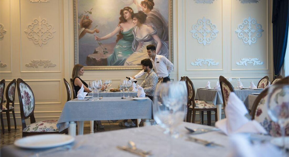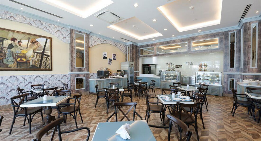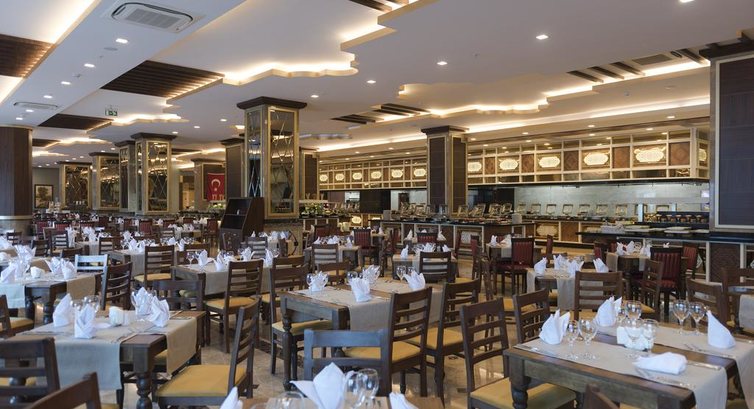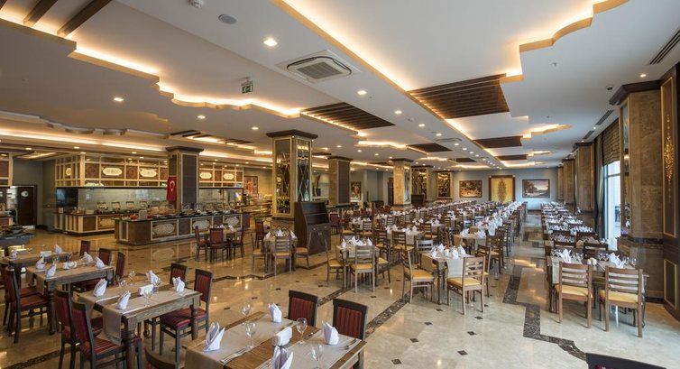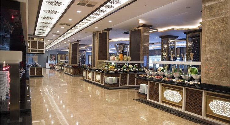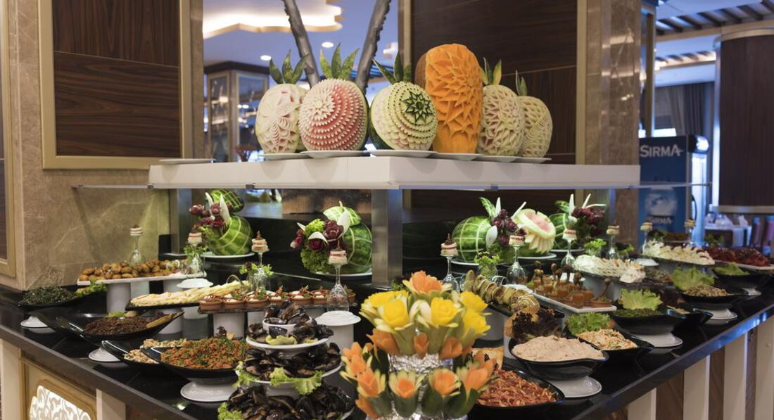 Ресторан хороший, еда достаточно разнообразная несколько видов мяса рыба курица шт. 6 салатов гарниров закусок пирожных пахлавы,мороженое тоже есть, из фруктов яблоки апельсины абрикосы, пару раз арбуз и дыня ( зеленая но очень сладкая). также в отеле есть кондитерская и снек-зона где можно перекусить.