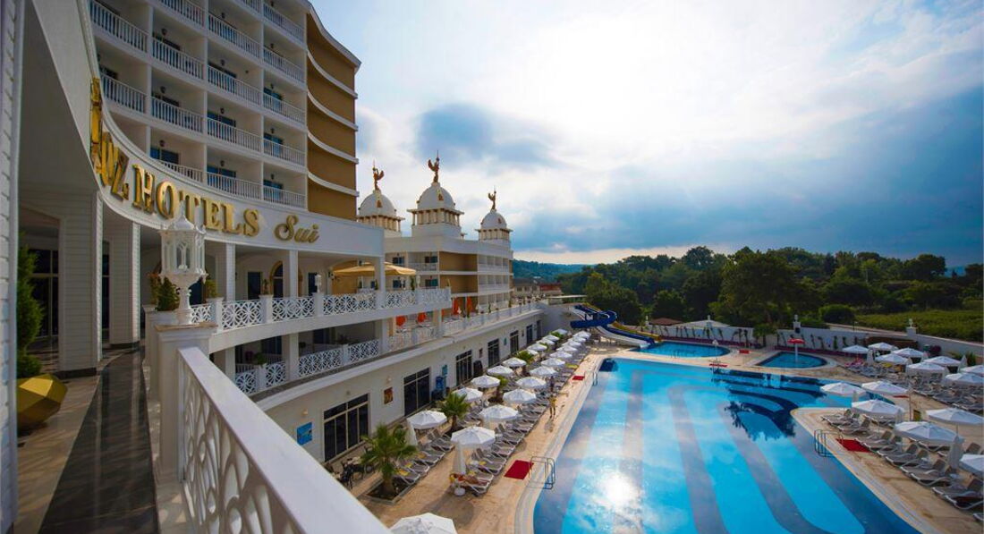 Ездили с подругой на открытие. От аэропорта Анталии 1час 50 минут с остановкой 15 минут. Заезжали в два отеля рядом с Sui. С виду красивый отель ,рядом с входом обустраивают скверик для посиделок с беседками ,столиками и лавочками. Сажают цветочки. Стоят уличные тренажеры. Домик охраны сделан под башенку. Рядом фонтан,ночью светится разными цветами. Как вышли из автобуса,забрали чемоданы,на ресепшене турок,хорошо говорит по-русски.Заполнили анкету и через 5 мин.,браслеты и карточка от номера и полотенец выдана Подарили в честь заезда по гвоздичке))) Щедры) .Как я поняла,всех заселили на 6 этаж. У нас был угловой номер с торца здания, вид отличный.Направо и налево море.Что порадовало.Номер меньше,чем те,которые идут вдоль здания. В номере тапки есть ,халатов нет. Чайника,утюга нет . В холодильнике только вода 2 литра.Фен есть.Из баночек шампунь,кондей и гель для душа,маленькое мыло и шапочка.Не пополнялись и не надо.Качество ужасное. Телевизор есть,выход USB есть,каналов полно,но вот музыкальных 1-2 канала. В номере одна кровать двухспальная и односпальная. Все чистое,НО не новое. Т.к. отель работал немного в том году под другим названием,полотенца и белье остались. Заселились,пошли завтракать.