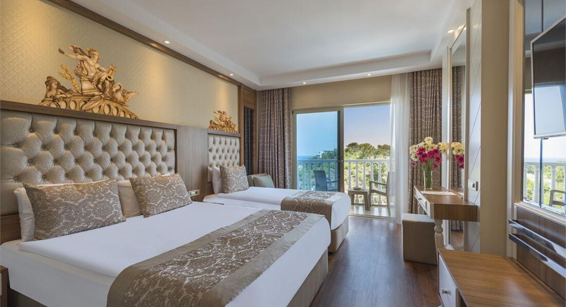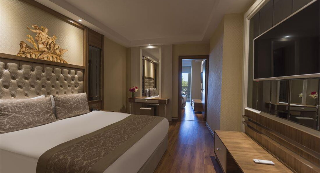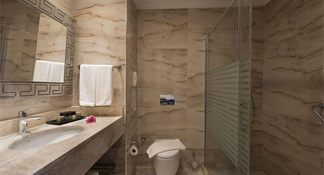 Прилетели мы в Анталию утром , на автобусе добрались весело и быстро до отеля , у нас был хороший гид Екатерина от Anex. Заселились очень быстро , номер не просили , в итоге дали трёхместный номер с видом на бассейн и море (5129) . Номера большие , чистые и светлые , отделка в современном стиле , система кондиционирования централизованная , сейф Бесплатно , в холодильнике свежая вода каждый день , телевизор , тапочки , фен есть , халаты не дают .Смена полотенцев каждый день , принадлежности для ванны обновляют по мере опустощения. Питание достаточное , голодными не останетесь , но хотелось бы мяса по разнообразнее и по чаще , меню не повторяющее изо дня в день . Детского стола как такового нет для маленьких , супы двух видов , овощи на пару и с утра каши большего я не заметила для маленьких , стульчики есть для детей . Отдыхающих с детьми до 3 лет было много , значит как то находили , чем кормить детей . Фруктов было не много , не сезон мы так поняли , клубнику раз давали или два , в основном яблоки , груши без вкусные . Алкоголь есть Любой бесплатно местный , вполне приятный пить можно , коктейли разные , соки натуральные , газ вода . Бассейн хороший, тёплый , три водные горки , бассейн для детей , полотенце меняют как пожелаете по карте . Так есть сауна и парная бесплатно , тренажёрный зал бесплатно. Хамам по 30 баксов с человека . Вечером анимация слабовата , за 7 дней была два раза . На пляже были три раза , так как дорого до пляжа очень крутая и не облагорожена , чтоб ходить пешком . На трансфере 5 мин и вы там - пляж облагорожен лежаки, навес , душ , бар , детская площадка , места всегда всем есть . Море мелкая галька , вход спокойный не резкий , чисто . Персонал отеля очень дружелюбный и внимательный , если возникают вопросы тут же все решается , практически все русскогоговорящие . Посоветовала бы я этот отель друзьям , да , вернулась бы я сюда с нова , да конечно .