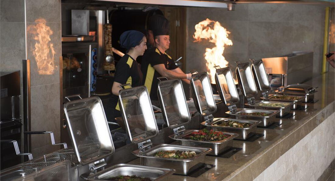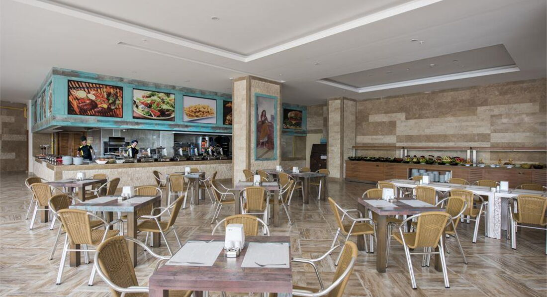 Питание - омаров и лангустов конечно не наблюдалось с манго и ананасами, но как говорится - " А шо Вы хотели за такие деньги?" Тем не менее пяти-разовое питание предлагало практически ежедневно : СВЕЖУЮ ( не мороженную или охлажденную) дорадо на гриле, разнообразный салат-бар, полный набор гарнира от кус-куса до обожаемой детьми картошки фри, разнообразное меню мяса адаптированное под европейского потребителя, а не только в османском стиле. Классика турецких сладостей и качественное мороженное. Да, свежевыдавленные соки не наблюдались, правда перед самым отъездом устанавливали фреш-станцию на лужайке перед входом в отель. Относительно нехватки мест, описанного в предыдущих постах, не хватало мест тем постояльцам, которые слабо ориентировались на местности, так как основному ресторану примыкали : детский ресторан, терраса для курящих и открытый зал пастерии. Что касается расторопности персонала, следует принять во внимание , что это только начало сезона и некоторые процессы не отточены, хотя очень радует, что исправления наступали буквально на следующий день. Линейный персонал искренне старается , а менеджмент чувствуется, оставаясь не видимым. Что меня , как сотрудника ресторанной сферы порадовало. Питание в данном отеле могу охарактеризовать следующим образом : Мой муж проработавшем в ресторанной сфере более 20 лет и оценивающему с профессиональной точки зрения, с увереностю говорит: в этом отеле было НЕ страшно кушать!