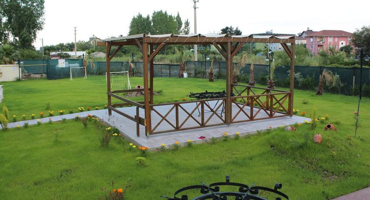 Сам отель маленький, темный, тесный, ну как почти все трешки в Турции. Территория маленькая, развлечений для детей кроме лягушатника нет. Позади здания есть газончик с одним гамаком, который наша малявочка приняла за качельку. Под палящим солнцем там делать нечего.