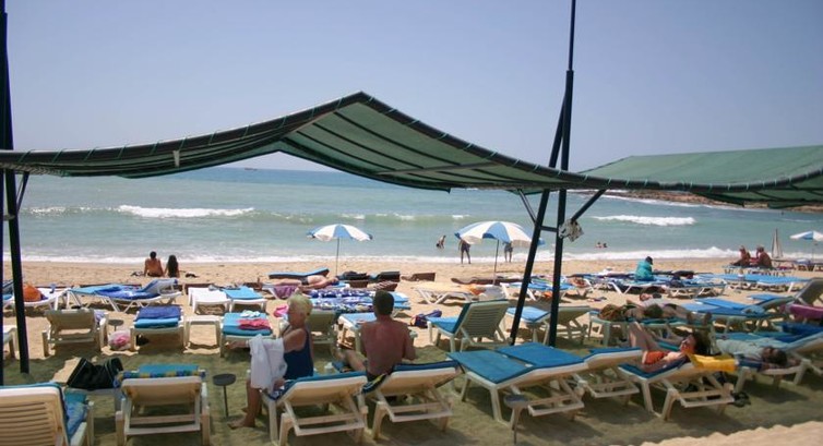 Пляж -узкая полоска песка вдоль бухты,вход в море мелкая галька,метрах в 20 от берега можно поранить ноги о подводные камни если не знаешь,это минус.Отдыхающих было много,все лежаки у бассейнов и моря заняты их как оказалось надо занимать с 7-00ч.