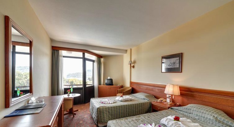 Заселили меня в номер, увидев который, я была разочарована, Тусклый свет, старая мебель, подтеки от ржавчины в около крана в ванной, но тем не менее чисто. Порадовал балкон с видом на горы и центральный вход в отель, одна из самых тихих сторон отеля.