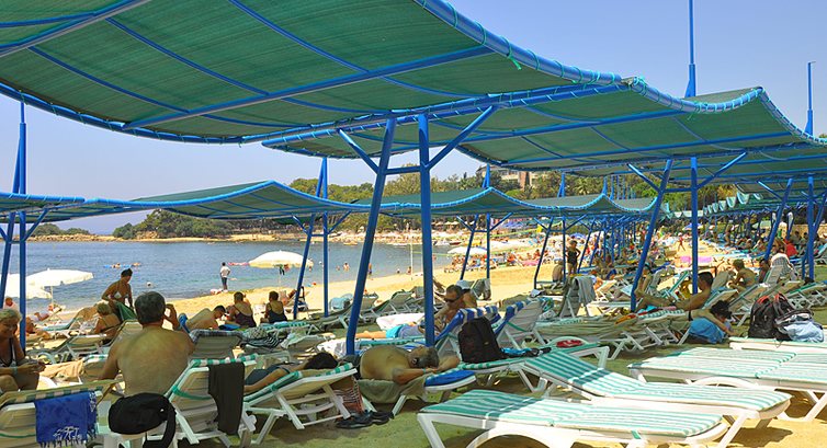 Пляж под навесами,лежаков всегда хватало. Море шикарное, тёплое.