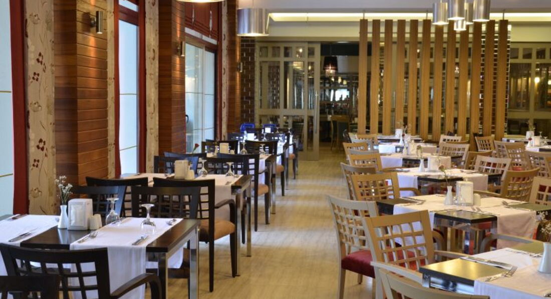 Бари та ресторани: Сніданок з 07:00-10:00, пізній сніданок з 10:00-11:00, обід з 12:30-14:00, вечеря з 18:30-21:00, пізня вечеря з 00: 00-01:00. Шведський стіл. Зразкове дитяче меню: спагетті, м'ясні кульки, сосиски, смажена картопля, солодощі. Італійський ресторан, турецький ресторан, рибний ресторан. Годинник роботи: з 19:00-21:00. Потрібна попередня резервація. 1 відвідування за весь період відпочинку безкоштовно. Лобі-бар: вміщує до 150 осіб; Диско-бар (платно), що вміщує до 50 осіб; Beach Bar: вміщує до 110 осіб, легкі закуски з 12:00 до 16:00; Бар біля басейну: час чаю з 16:00-17:00 вміщує до 50 осіб.