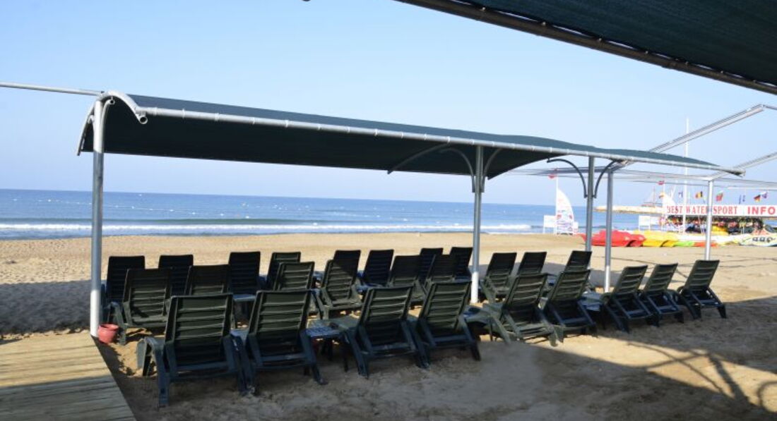 Пляж: на пляже чисто (за исключением попадавшихся в песке окурков), в баре всегда приветливый персонал. Лежаков всегда хватало, кстати они очень удобные, матерчатые, а не пластмассовые. Вход в море очень пологий, что очень хорошо для ребятишек и взрослых, которые опасаются воды.