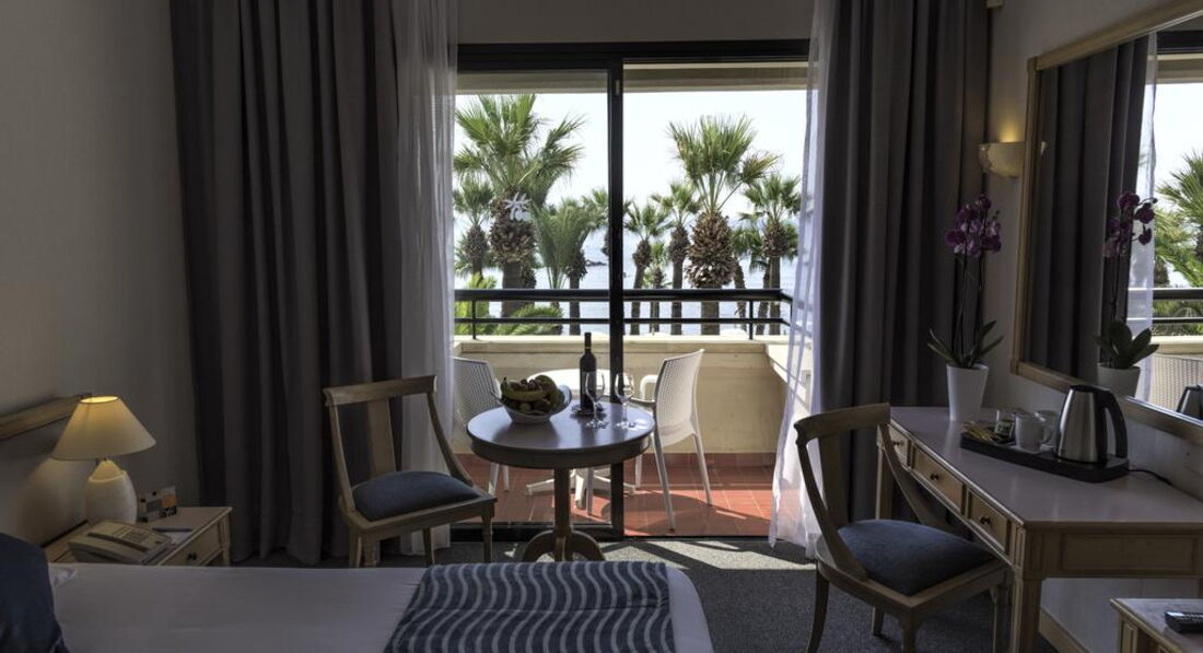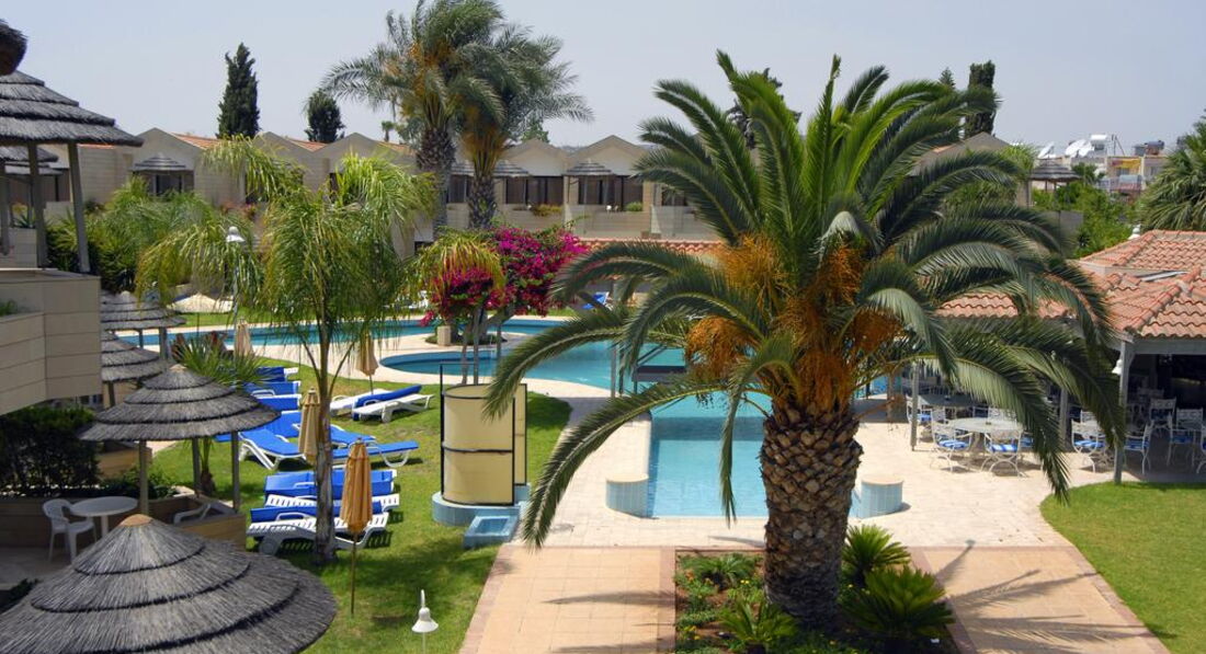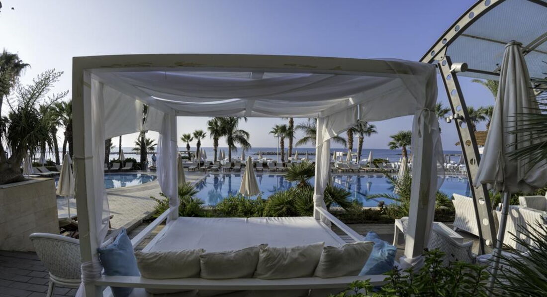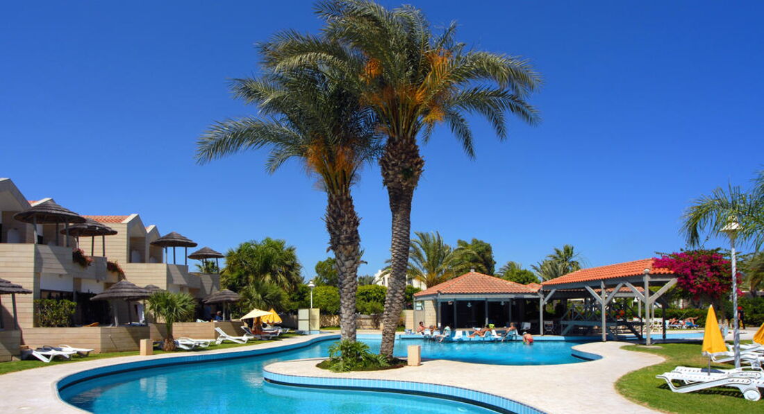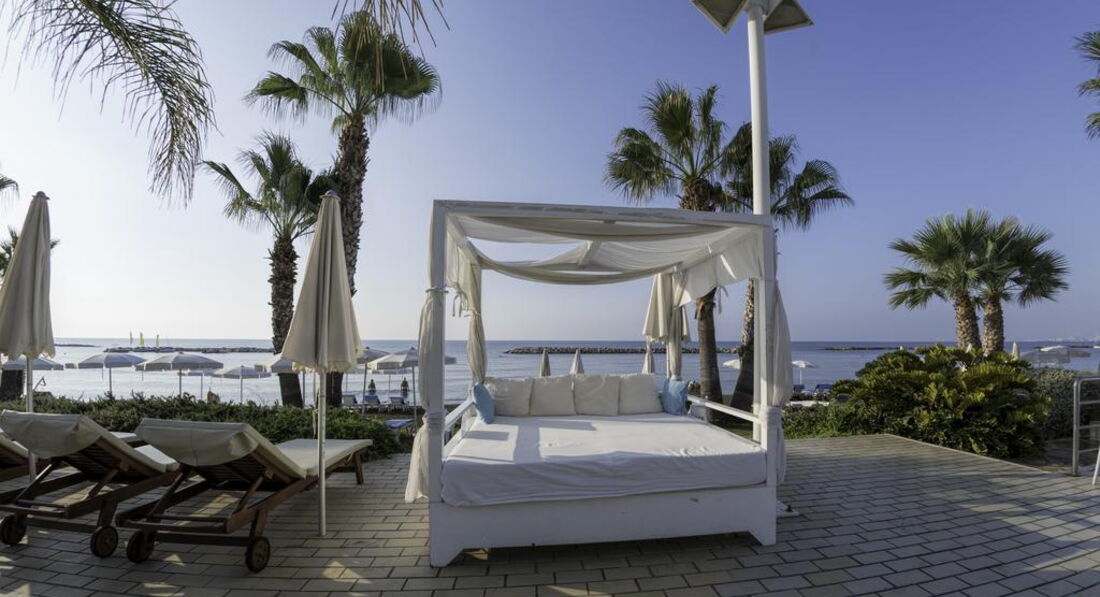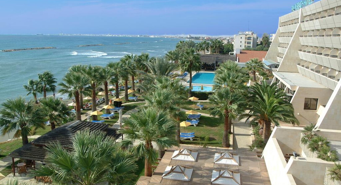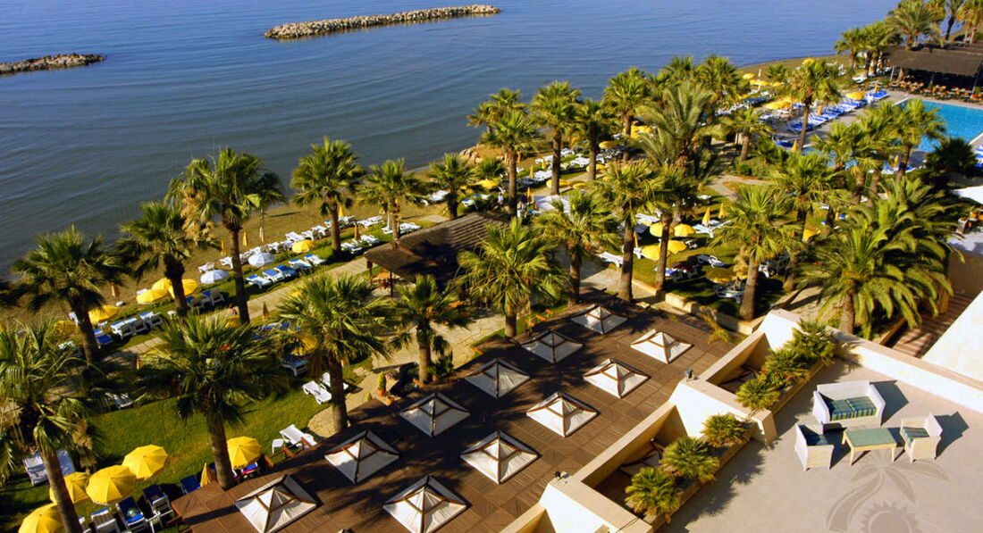 На березі піщаного пляжу в оточенні пальмового гаю, відстань до міжнародного аеропорту Ларнака – 14 км, до центру курорту – 6 км.