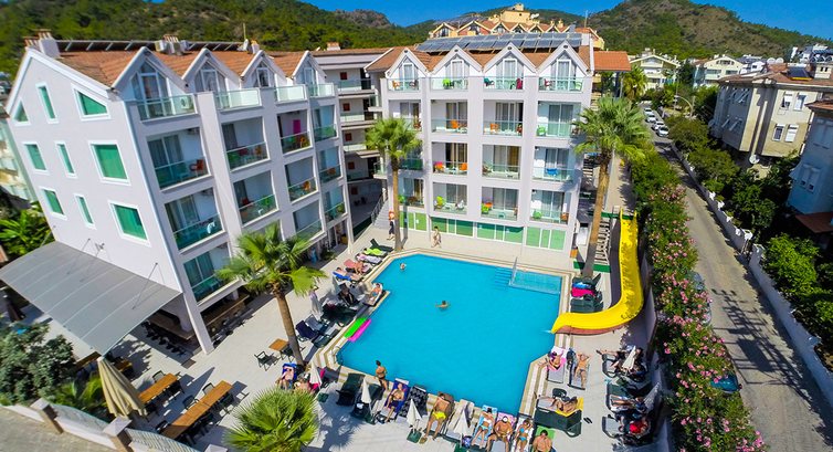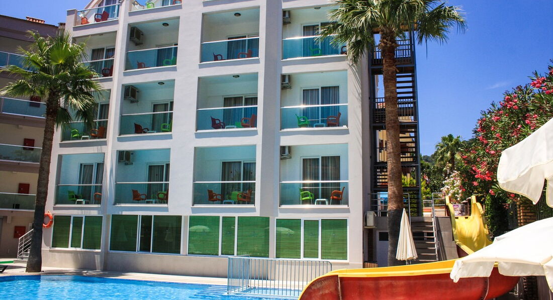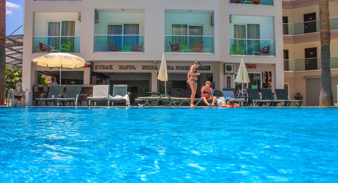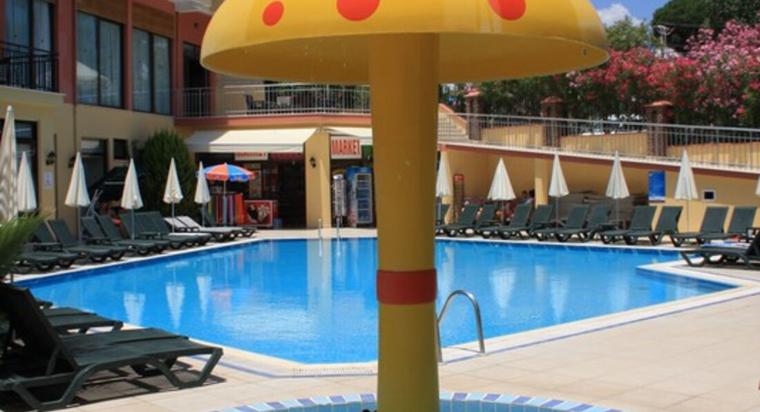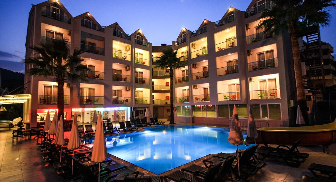 Отдыхали в Мармарисе с 22июня по 2 июля, приехали ночью нас сразу заселили в номер, номер хороший только с уборкой плохо, непонятно вообще мыли ли полы. Еда однообразная , но вкусная. Персонал приветливый) и конечно же аниматор Чико остались в восторге от его работы веселил всех, впервые играли в водное поло! Пляжа своего нет у отеля, но мы на третий день нашли бесплатный идти мин 7-10 ,там и зонты и шезлонги, и пантон с подушками в море, на нём и позагорать и попрыгать с него в море можно! Брали велосипеды в прокат,прокат стоит 5 лир час и 10 лир 3-4 часа, катались по набережной в Ичмелер, Море кристально чистое и спокойное в Мармарисе! Так же до-рынка ехать на маршрутке 5-7 мин, и просто выйдя из отеля можно прогуляться по магазинам. Недалеко от отеля банкомат на русском языке)Не советуем брать экскурсии у гида ,они в два раза дороже,и ни чем не отличаются!!Берите на улице там много русско-говорящих и делают скидки если брать много экскурсий, замечательные экскурсии в памуккале и на джип сафари. Вечером Чико всех собирает на бар стрит, там много клубов обошли все)) это было шикарно, можно уехать в 3 ночи с чико обратно,либо самим на маршрутке или пешком, идти мин 40.Отдыхом довольны на все сто!!! Обязательно ещё вернёмся в Мармарис!