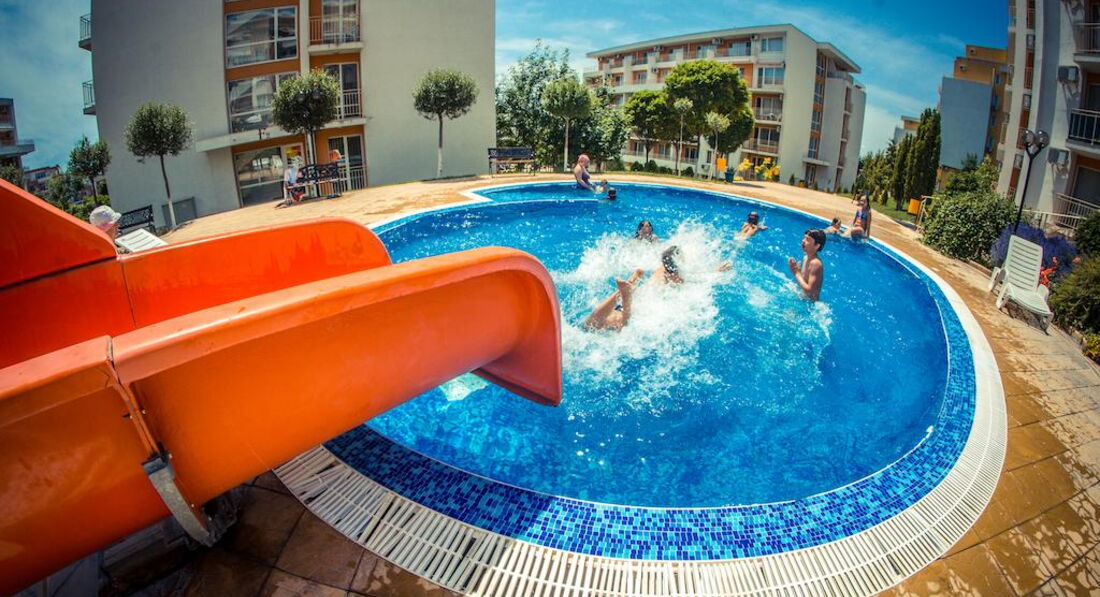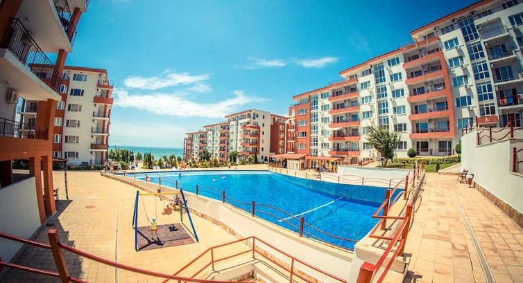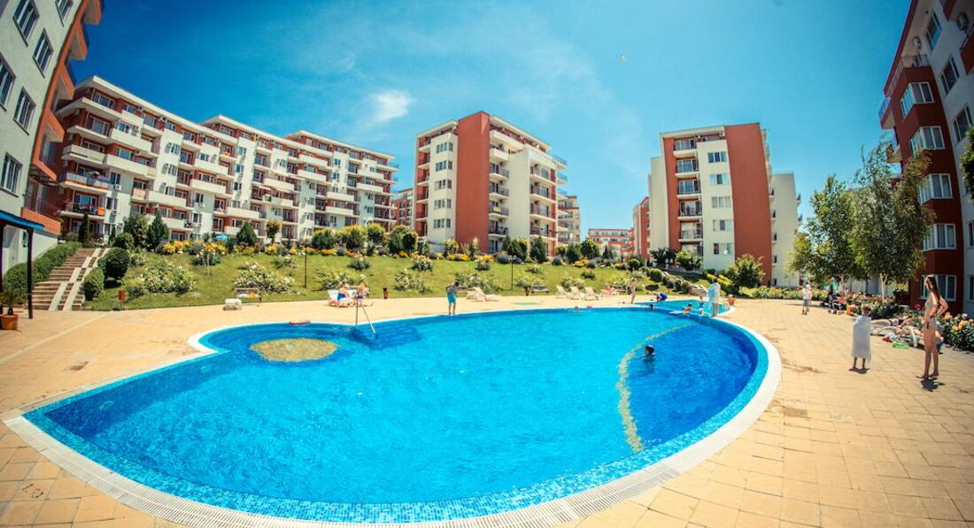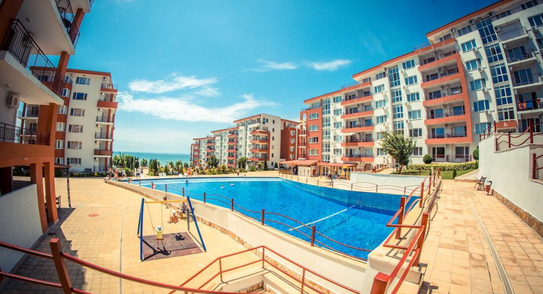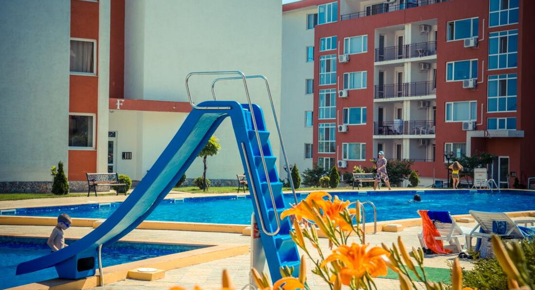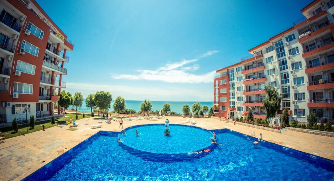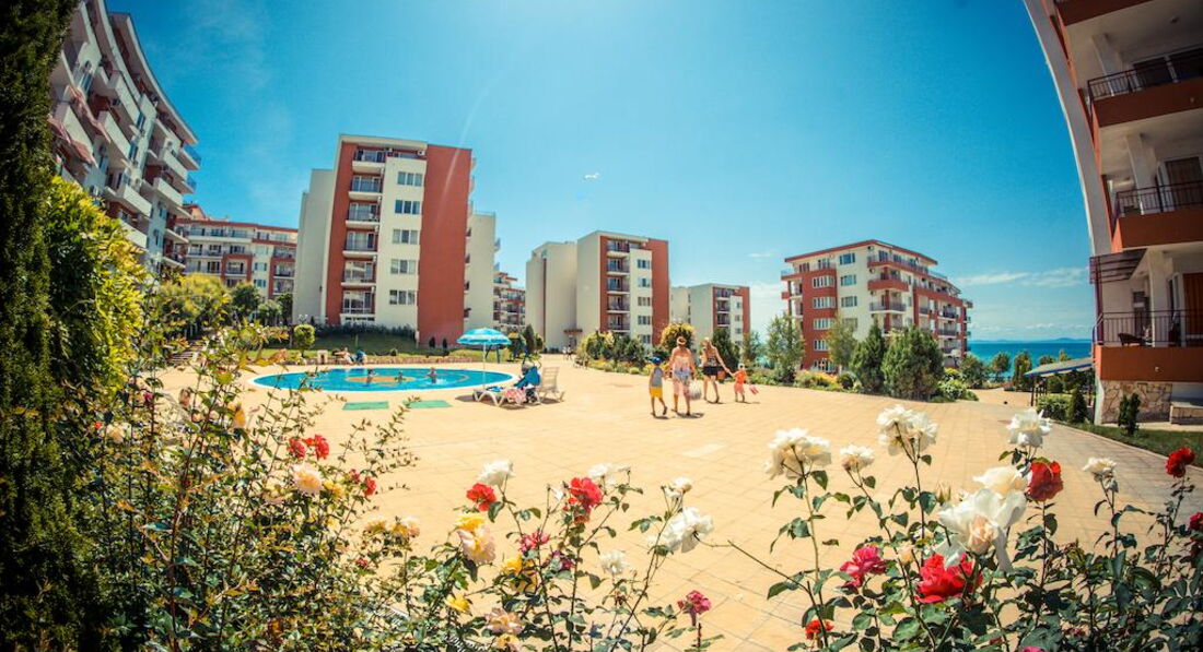 Отдыхала в этом отелей с мужем и ребенком 2 лет. Комплекс не плохой, бассейнов много, территория ухоженная. На территории есть магазины продуктовые, аптека, мясной магазин, прокаты детских машинок, велосипедов, самокатов, 2 кафешки( кормят не плохо), 1 кафе-бар, пару магазинчиков с сувенирами, игрушками и тряпками. Кстати бассейн с искусственными волнами за целый месяц ни разу не работал. Куча детских площадок, но они все практически одинаковые, площадка с тренажерами, песочница. Куча детских бассейнов, но мы в них не купались. В принципе детям есть чем заняться, детей тут и в правду полно. Единственное чего не хватает, это вечерней анимации как для взрослых так и для детей. Приходилось вечером ходить в соседний отель, там было детское мини-диско и потом для взрослых анимация (мы правда никогда на нее не оставались, но думаю что она была на английском языке, так как в отеле полно не русских). Пляжей и как и писали ранее 2 один возле комплекса Марина и второй возле Панорамы. Пляжи песчаные, грязи не видела, в море были водоросли иногда даже зайти было не приятно, ощущение как будто в жижу какую то слизскую заходишь, но это все Черное море ничего с этим не поделаешь. Лежаки с зонтиками платные 9 лев лежак и 9 лев зонтик (9 лев=200 руб). Отель находится за городом поэтому погулять за пределами отеля не где. До города можно добраться на автобусе или на маршрутке от отеля. Остановка находится прям возле отеля.