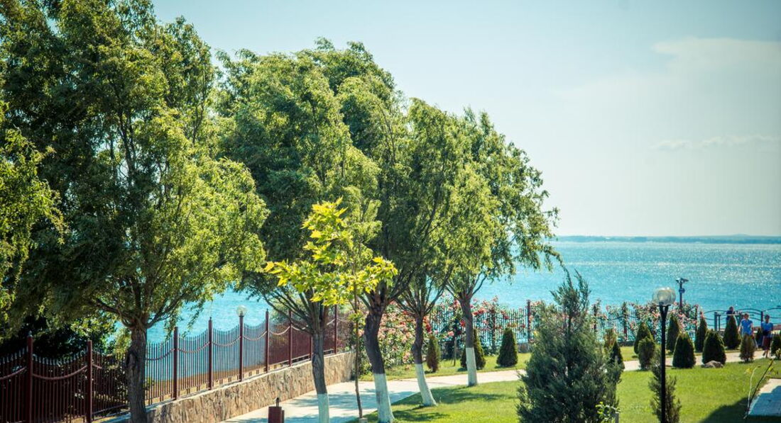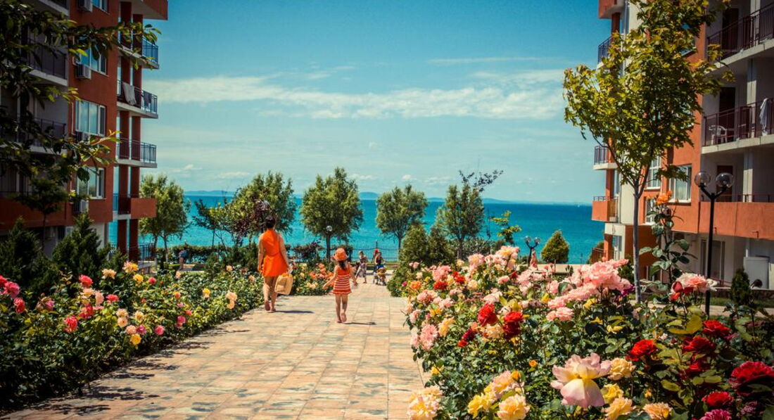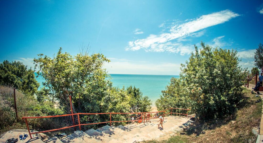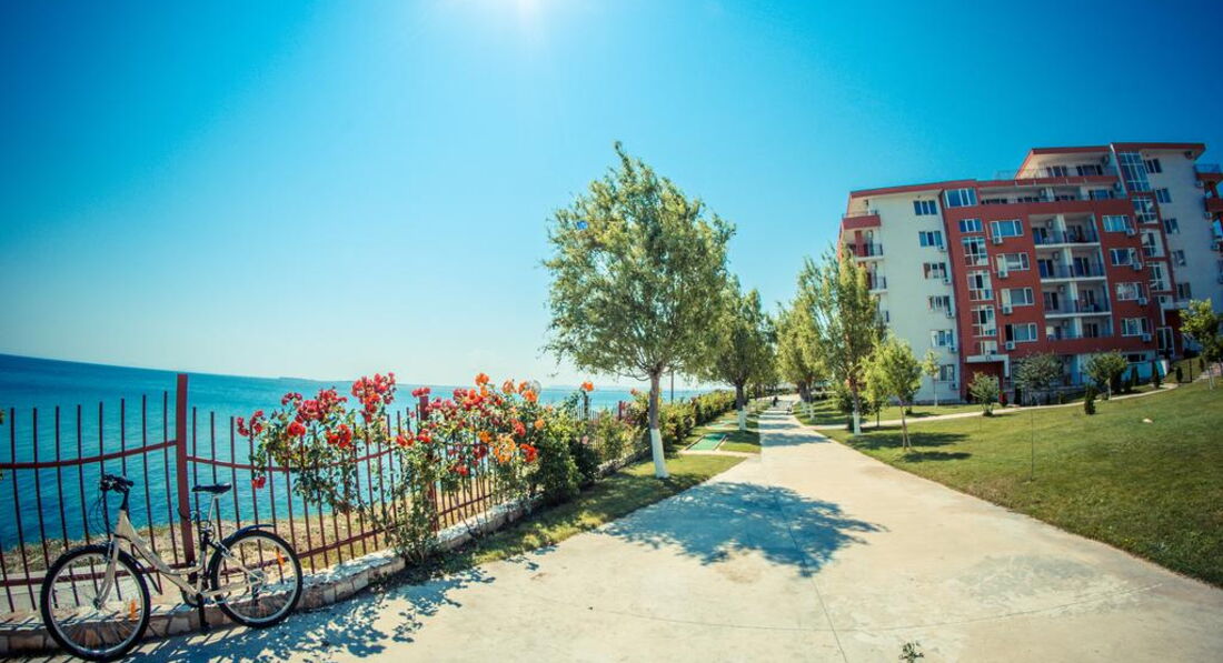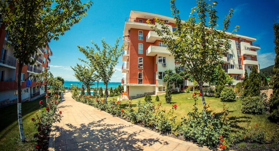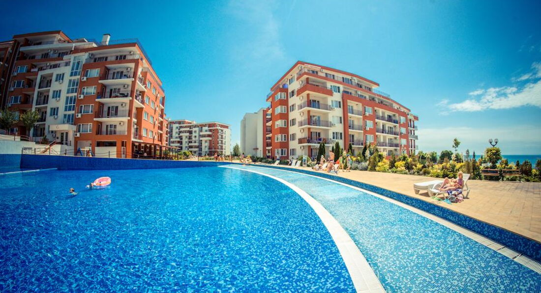 Отдыхала в этом отелей с мужем и ребенком 2 лет. Комплекс не плохой, бассейнов много, территория ухоженная. На территории есть магазины продуктовые, аптека, мясной магазин, прокаты детских машинок, велосипедов, самокатов, 2 кафешки( кормят не плохо), 1 кафе-бар, пару магазинчиков с сувенирами, игрушками и тряпками. Кстати бассейн с искусственными волнами за целый месяц ни разу не работал. Куча детских площадок, но они все практически одинаковые, площадка с тренажерами, песочница. Куча детских бассейнов, но мы в них не купались. В принципе детям есть чем заняться, детей тут и в правду полно. Единственное чего не хватает, это вечерней анимации как для взрослых так и для детей. Приходилось вечером ходить в соседний отель, там было детское мини-диско и потом для взрослых анимация (мы правда никогда на нее не оставались, но думаю что она была на английском языке, так как в отеле полно не русских). Пляжей и как и писали ранее 2 один возле комплекса Марина и второй возле Панорамы. Пляжи песчаные, грязи не видела, в море были водоросли иногда даже зайти было не приятно, ощущение как будто в жижу какую то слизскую заходишь, но это все Черное море ничего с этим не поделаешь. Лежаки с зонтиками платные 9 лев лежак и 9 лев зонтик (9 лев=200 руб). Отель находится за городом поэтому погулять за пределами отеля не где. До города можно добраться на автобусе или на маршрутке от отеля. Остановка находится прям возле отеля.