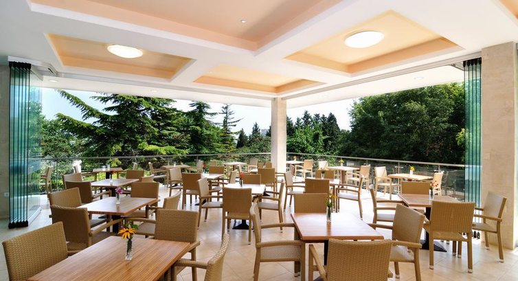 Ресторан по системе All inclusive у Панорамы общий с соседним отелем Компас. И бассейн тоже общий. В ресторане не было достаточного выбора еды для ребенка-не было каш,молоко порошковое ужасного вкуса,В ресторане практически всегда огромное количество людей,не хватает столиков,очередь растягивается на 20-30 минут.Однообразое меню на завтрак-все 10 дней одно и то же... Слабый выбор в лобби-баре.Детские группы постоянно отдыхают в этх двух отелях и по гостинице бегают бесконтрольные подростки.