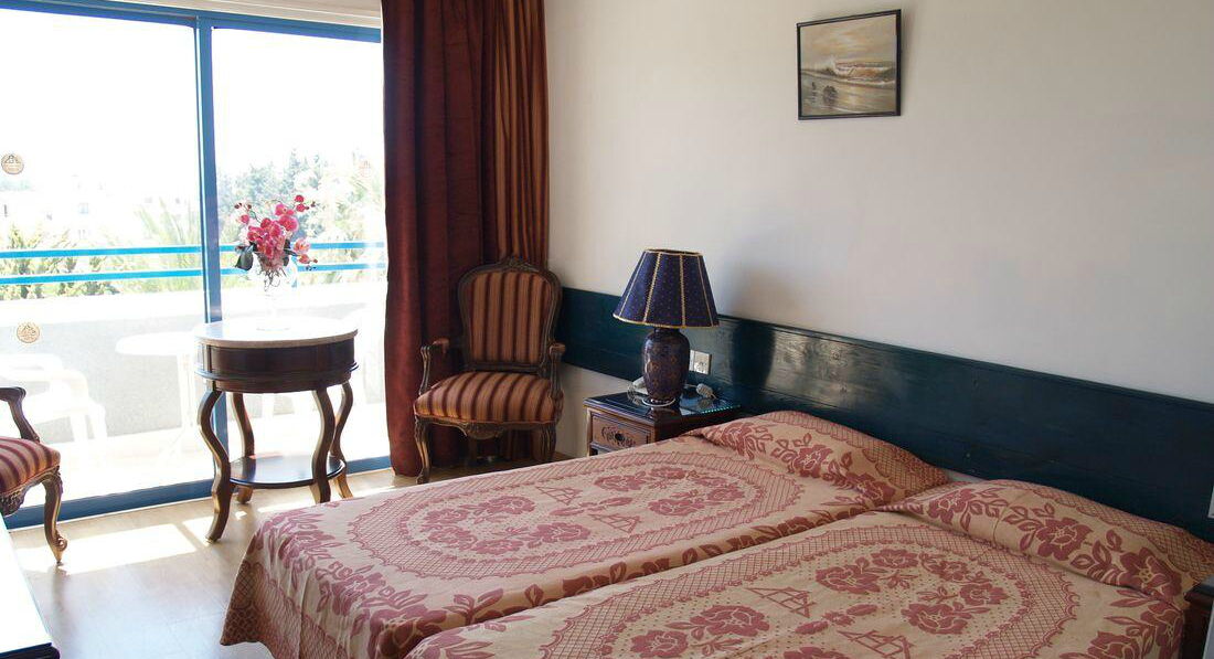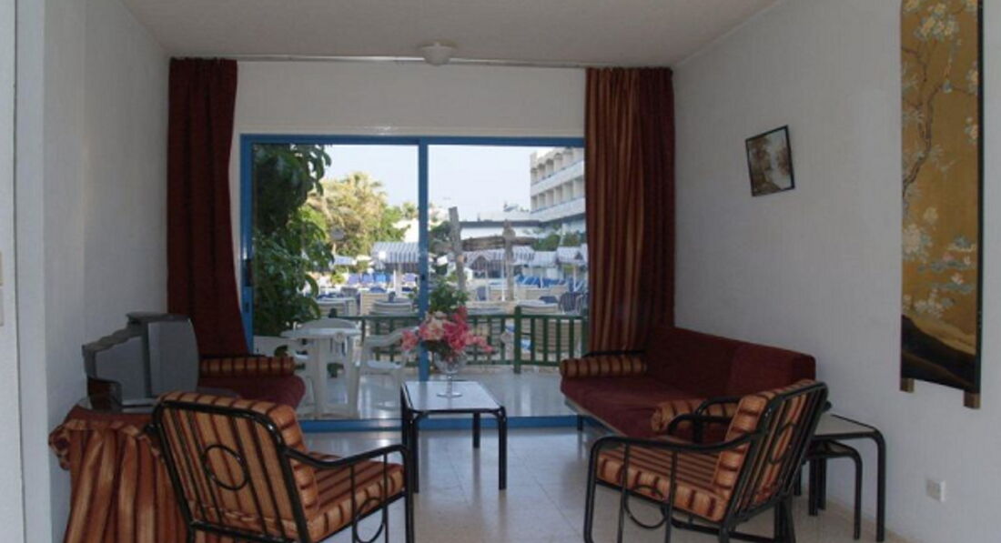 Теперь об отдыхе и отеле. Отдыхала в мае 2017г. Приехали в отель рано, около 11 часов. Заселение у них строго в 14.00, как и везде в Европе. Можно оставить вещи в комнате отдыха и спокойно заняться своими делами. Я, например, переоделась, благо туалет здесь же и очень чистый, и пошла загорать и купаться к бассейну. Персонал по -русски не говорит, но базовых знаний английского уровня средней школы вполне достаточно.Номера стандарт вполне сносные. Кондиционер в стандартах бесплатный, в аппартаментах 6 евро в сутки. Номера стандарт находятся в главном 3 этажном здании с лифтом. Аппартаменты - в отдельностоящих 2 этажных зданиях вокруг,лифта на второй этаж там нет. Некоторые номера на первом этаже имеют пандус с балкона для людей с ограниченными способностями, поэтому если вам "повезет" стать обладателем такого номера, то у вас можно сказать как такового балкона не будет, сразу с балкона выход на улицу. Поэтому совет - не переплачивайте за аппартаменты, если не собираетесь сами готовить себе еду, за счет того, что в комнату втиснуты кухонная мебель и диванчик, комнаты очень тесные. Простой стандарт реально удобней. Убирались каждый день, кроме воскресенья. Постель меняли через неделю, полотенца тоже.Напор горячей воды сначала слабый, потом резко увеличивается, поэтому можно обжечься, будьте осторожны. Система смывных бачков на Кипре рассчитана на экономию воды, поэтому приходится ждать подкачки воды. На потолке были видны следы шпатлевки, но отдыхать это никак не мешало. Адаптер для розетки можно либо купить за 1 евро на рецепшене, либо обойтись без него. На ютюбе полно видео как это сделать.